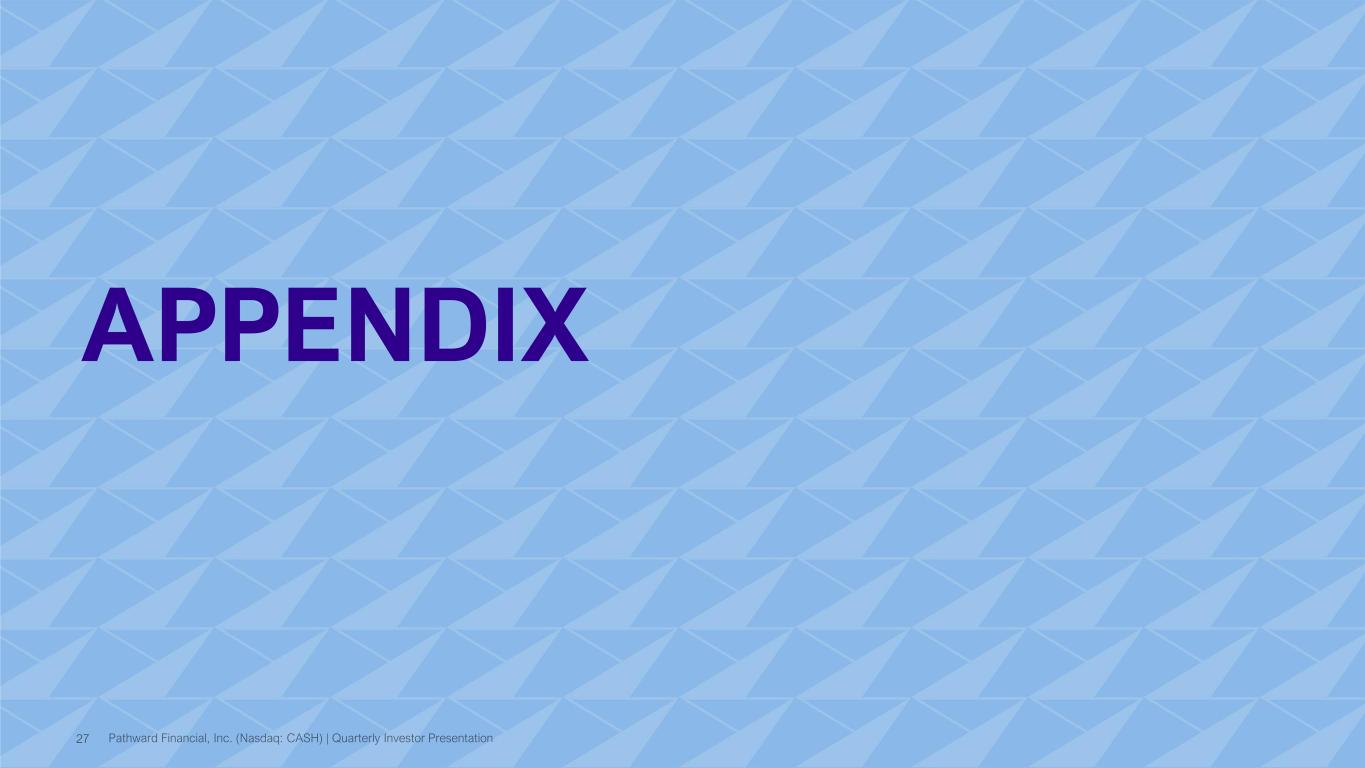 Pathward Financial, Inc. (Nasdaq: CASH) | Quarterly Investor Presentation26 Capital and Sources of Liquidity Regulatory Capital as of September 30, 2023 At September 30, 2023¹ Pathward Financial, Inc. Pathward, N.A. Tier 1 Leverage 8.11% 8.32% Common Equity Tier 1 11.25% 11.81% Tier 1 Capital 11.50% 11.81% Total Capital 12.84% 12.76% Primary & Secondary Liquidity Sources ($ in millions) Cash and Cash Equivalents $375 Unpledged Investment Securities $83 FHLB Borrowing Capacity $785 Funds Available through Fed Discount Window $252 Unsecured Funding Providers $875 Deposit Balances Held at Other Banks $268 Total Liquidity $2,638 1 Regulatory capital reflects the Company's election of the five-year CECL transition for regulatory capital purposes. Amounts are preliminary pending completion and filing of the Company's regulatory reports. . 8.10% 8.37% 7.53% 8.40% 8.11%8.19% 8.68% 7.79% 8.67% 8.32% 4Q22 1Q23 2Q23 3Q23 4Q23 Tier 1 Leverage Ratio 13.88% 14.29% 14.06% 13.45% 12.84% 13.57% 14.29% 14.03% 13.42% 12.76% 4Q22 1Q23 2Q23 3Q23 4Q23 Total Capital Ratio Pathward Financial, Inc. Pathward, N.A. Minimum Requirement to be Well-Capitalized under Prompt Corrective Action Provisions