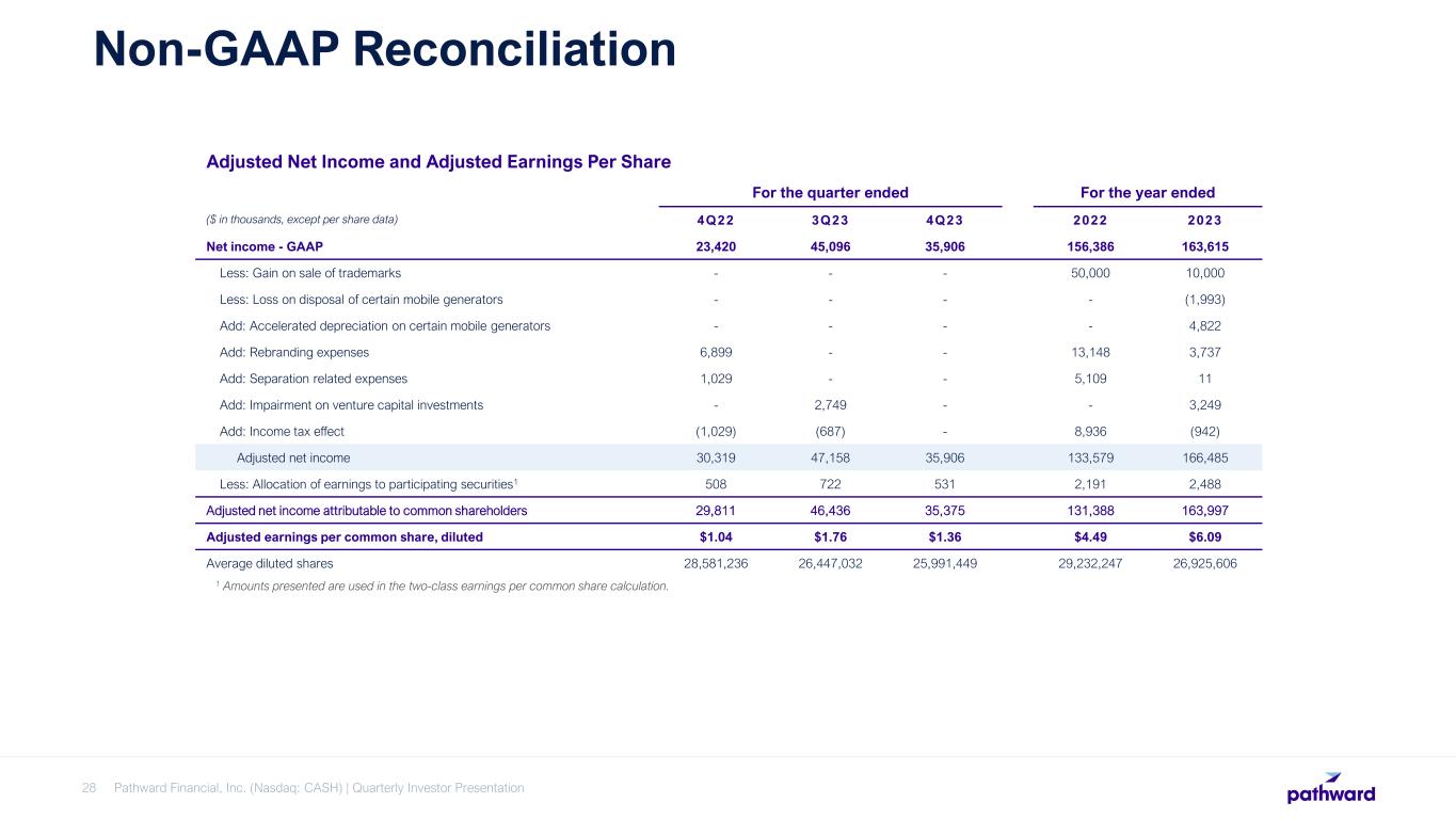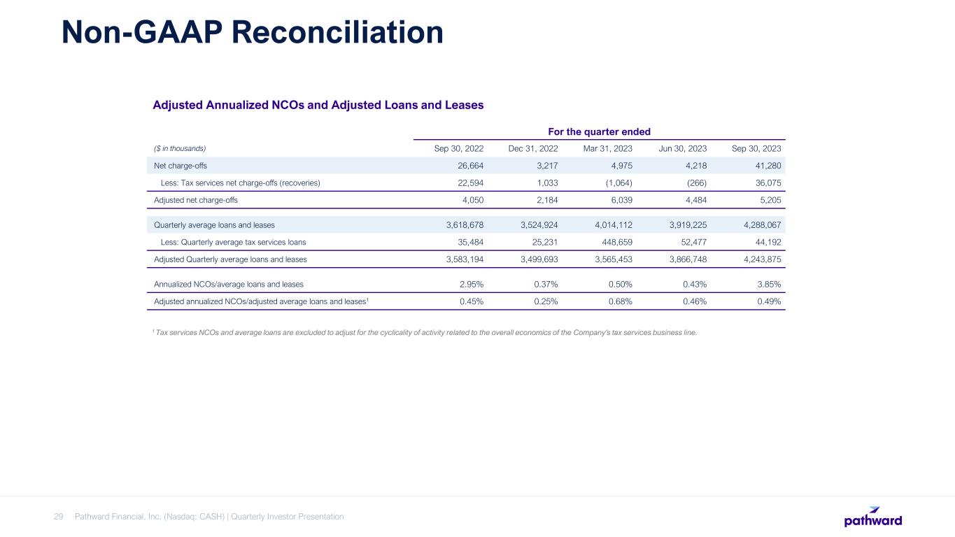 Pathward Financial, Inc. (Nasdaq: CASH) | Quarterly Investor Presentation28 Non-GAAP Reconciliation Adjusted Net Income and Adjusted Earnings Per Share For the quarter ended For the year ended ($ in thousands, except per share data) 4Q22 3Q23 4Q23 2022 2023 Net income - GAAP 23,420 45,096 35,906 156,386 163,615 Less: Gain on sale of trademarks - - - 50,000 10,000 Less: Loss on disposal of certain mobile generators - - - - (1,993) Add: Accelerated depreciation on certain mobile generators - - - - 4,822 Add: Rebranding expenses 6,899 - - 13,148 3,737 Add: Separation related expenses 1,029 - - 5,109 11 Add: Impairment on venture capital investments - 2,749 - - 3,249 Add: Income tax effect (1,029) (687) - 8,936 (942) Adjusted net income 30,319 47,158 35,906 133,579 166,485 Less: Allocation of earnings to participating securities1 508 722 531 2,191 2,488 Adjusted net income attributable to common shareholders 29,811 46,436 35,375 131,388 163,997 Adjusted earnings per common share, diluted $1.04 $1.76 $1.36 $4.49 $6.09 Average diluted shares 28,581,236 26,447,032 25,991,449 29,232,247 26,925,606 1 Amounts presented are used in the two-class earnings per common share calculation.