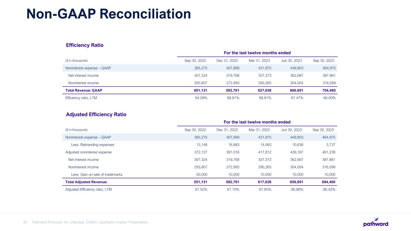 Pathward Financial, Inc. (Nasdaq: CASH) | Quarterly Investor Presentation30 Non-GAAP Reconciliation For the last twelve months ended ($ in thousands) Sep 30, 2022 Dec 31, 2022 Mar 31, 2023 Jun 30, 2023 Sep 30, 2023 Noninterest expense – GAAP 385,275 407,899 431,875 449,803 464,975 Net interest income 307,324 319,768 337,373 362,687 387,861 Noninterest income 293,807 272,993 290,265 304,004 316,599 Total Revenue: GAAP 601,131 592,761 627,638 666,691 704,460 Efficiency ratio, LTM 64.09% 68.81% 68.81% 67.47% 66.00% For the last twelve months ended ($ in thousands) Sep 30, 2022 Dec 31, 2022 Mar 31, 2023 Jun 30, 2023 Sep 30, 2023 Noninterest expense – GAAP 385,275 407,899 431,875 449,803 464,975 Less: Rebranding expenses 13,148 16,883 14,063 10,636 3,737 Adjusted noninterest expense 372,127 391,016 417,812 439,167 461,238 Net interest income 307,324 319,768 337,373 362,687 387,861 Noninterest income 293,807 272,993 290,265 304,004 316,599 Less: Gain on sale of trademarks 50,000 10,000 10,000 10,000 10,000 Total Adjusted Revenue: 551,131 582,761 617,638 656,691 694,460 Adjusted Efficiency ratio, LTM 67.52% 67.10% 67.65% 66.88% 66.42% Efficiency Ratio Adjusted Efficiency Ratio