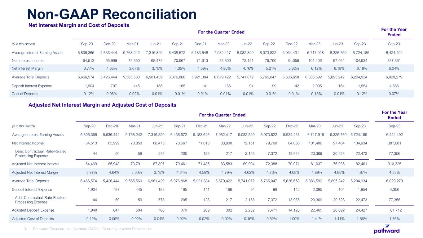 Pathward Financial, Inc. (Nasdaq: CASH) | Quarterly Investor Presentation31 Non-GAAP Reconciliation For the Quarter Ended For the Year Ended ($ in thousands) Sep-20 Dec-20 Mar-21 Jun-21 Sep-21 Dec-21 Mar-22 Jun-22 Sep-22 Dec-22 Mar-23 Jun-23 Sep-23 Sep-23 Average Interest Earning Assets 6,806,366 5,636,444 9,768,242 7,316,820 6,438,572 6,183,646 7,082,417 6,082,329 6,073,822 5,934,431 6,717,918 6,326,750 6,724,185 6,424,492 Net Interest Income 64,513 65,999 73,850 68,475 70,667 71,613 83,800 72,151 79,760 84,056 101,406 97,464 104,934 387,861 Net Interest Margin 3.77% 4.65% 3.07% 3.75% 4.35% 4.59% 4.80% 4.76% 5.21% 5.62% 6.12% 6.18% 6.19% 6.04% Average Total Deposits 6,466,574 5,426,444 9,565,560 6,981,439 6,076,868 5,921,384 6,679,422 5,741,072 5,765,047 5,636,658 6,386,592 5,895,242 6,204,934 6,029,279 Deposit Interest Expense 1,904 797 445 188 165 141 166 94 99 142 2,095 164 1,954 4,356 Cost of Deposits 0.12% 0.06% 0.02% 0.01% 0.01% 0.01% 0.01% 0.01% 0.01% 0.01% 0.13% 0.01% 0.12% 0.07% Net Interest Margin and Cost of Deposits Adjusted Net Interest Margin and Adjusted Cost of Deposits For the Quarter Ended For the Year Ended ($ in thousands) Sep-20 Dec-20 Mar-21 Jun-21 Sep-21 Dec-21 Mar-22 Jun-22 Sep-22 Dec-22 Mar-23 Jun-23 Sep-23 Sep-23 Average Interest Earning Assets 6,806,366 5,636,444 9,768,242 7,316,820 6,438,572 6,183,646 7,082,417 6,082,329 6,073,822 5,934,431 6,717,918 6,326,750 6,724,185 6,424,492 Net Interest Income 64,513 65,999 73,850 68,475 70,667 71,613 83,800 72,151 79,760 84,056 101,406 97,464 104,934 387,681 Less: Contractual, Rate-Related Processing Expense 44 50 59 578 205 128 217 2,158 7,372 13,985 20,369 20,528 22,473 77,356 Adjusted Net Interest Income 64,469 65,948 73,791 67,897 70,461 71,485 83,583 69,994 72,388 70,071 81,037 76,936 82,461 310,325 Adjusted Net Interest Margin 3.77% 4.64% 3.06% 3.75% 4.34% 4.59% 4.79% 4.62% 4.73% 4.68% 4.89% 4.88% 4.87% 4.83% Average Total Deposits 6,466,574 5,426,444 9,565,560 6,981,439 6,076,868 5,921,384 6,679,422 5,741,072 5,765,047 5,636,658 6,386,592 5,895,242 6,204,934 6,029,279 Deposit Interest Expense 1,904 797 445 188 165 141 166 94 99 142 2,095 164 1,954 4,356 Add: Contractual, Rate-Related Processing Expense 44 50 59 578 205 128 217 2,158 7,372 13,985 20,369 20,528 22,473 77,356 Adjusted Deposit Expense 1,948 847 504 766 370 269 382 2,252 7,471 14,128 22,465 20,692 24,427 81,712 Adjusted Cost of Deposits 0.12% 0.06% 0.02% 0.04% 0.02% 0.02% 0.02% 0.16% 0.52% 1.00% 1.41% 1.41% 1.56% 1.36%