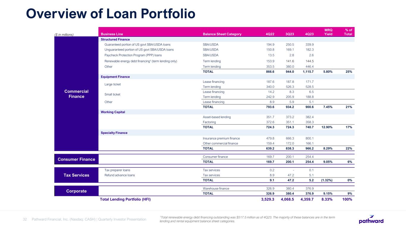 Pathward Financial, Inc. (Nasdaq: CASH) | Quarterly Investor Presentation 32 Overview of Loan Portfolio ($ in millions) Business Line Balance Sheet Category 4Q22 3Q23 4Q23 MRQ Yield % of Total Commercial Finance Structured Finance Guaranteed portion of US govt SBA/USDA loans SBA/USDA 194.9 250.5 339.9 Unguaranteed portion of US govt SBA/USDA loans SBA/USDA 150.8 169.1 182.3 Paycheck Protection Program (PPP) loans SBA/USDA 13.5 2.8 2.6 Renewable energy debt financing¹ (term lending only) Term lending 153.9 141.6 144.5 Other Term lending 353.5 380.0 446.4 TOTAL 866.6 944.0 1,115.7 5.80% 25% Equipment Finance Large ticket Lease financing 187.6 187.8 171.7 Term lending 340.0 526.3 528.5 Small ticket Lease financing 14.2 8.3 6.5 Term lending 242.9 205.9 188.8 Other Lease financing 8.9 5.9 5.1 TOTAL 793.6 934.2 900.6 7.45% 21% Working Capital Asset-based lending 351.7 373.2 382.4 Factoring 372.6 351.1 358.3 TOTAL 724.3 724.3 740.7 12.90% 17% Specialty Finance Insurance premium finance 479.8 666.3 800.1 Other commercial finance 159.4 172.0 166.1 TOTAL 639.2 838.3 966.2 8.29% 22% Consumer Finance Consumer finance 169.7 200.1 254.4 TOTAL 169.7 200.1 254.4 9.05% 6% Tax Services Tax preparer loans Tax services 0.2 - 0.1 Refund advance loans Tax services 8.9 47.2 5.1 TOTAL 9.1 47.2 5.2 (1.32%) 0% Corporate Warehouse finance 326.9 380.4 376.9 TOTAL 326.9 380.4 376.9 9.15% 9% Total Lending Portfolio (HFI) 3,529.3 4,068.5 4,359.7 8.33% 100% 1Total renewable energy debt financing outstanding was $517.5 million as of 4Q23. The majority of these balances are in the term lending and rental equipment balance sheet categories.