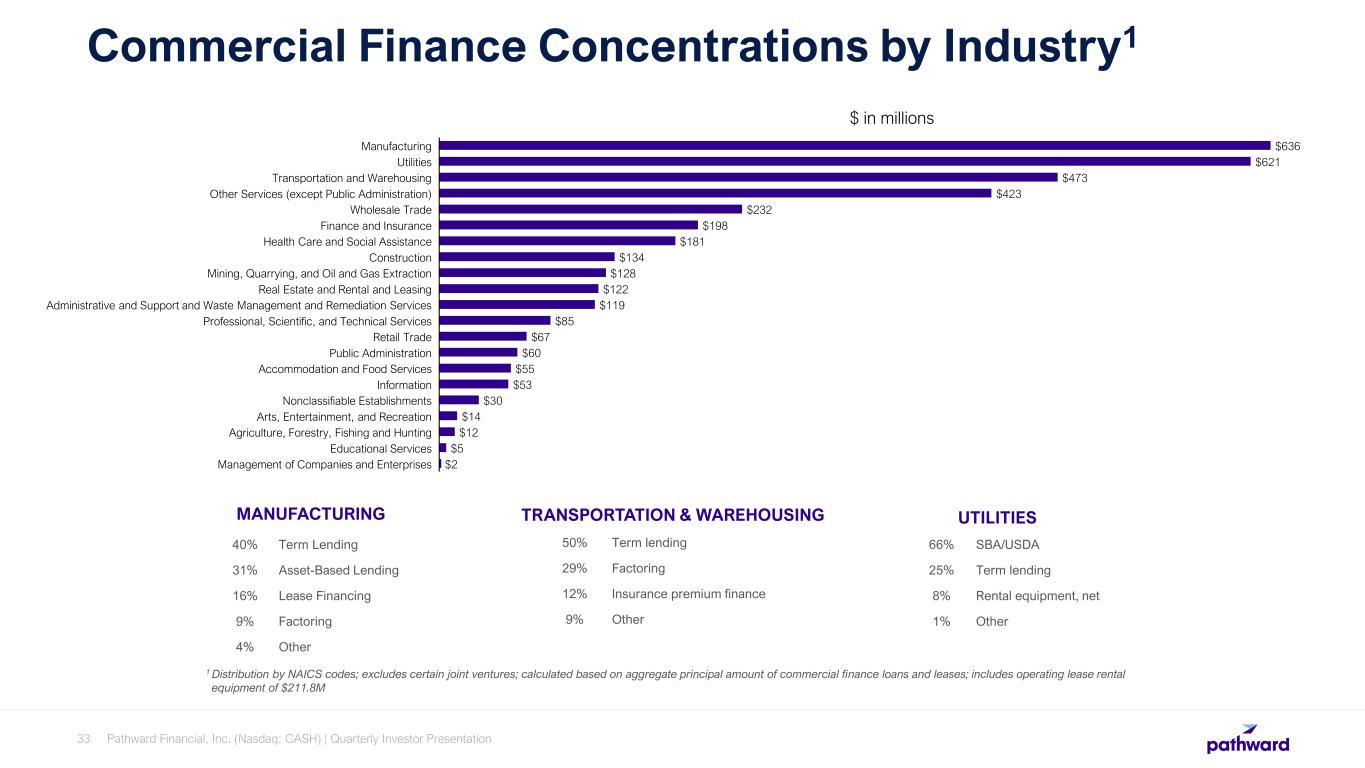Pathward Financial, Inc. (Nasdaq: CASH) | Quarterly Investor Presentation33 Commercial Finance Concentrations by Industry1 1 Distribution by NAICS codes; excludes certain joint ventures; calculated based on aggregate principal amount of commercial finance loans and leases; includes operating lease rental equipment of $211.8M MANUFACTURING 40% Term Lending 31% Asset-Based Lending 16% Lease Financing 9% Factoring 4% Other TRANSPORTATION & WAREHOUSING 50% Term lending 29% Factoring 12% Insurance premium finance 9% Other UTILITIES 66% SBA/USDA 25% Term lending 8% Rental equipment, net 1% Other $636 $621 $473 $423 $232 $198 $181 $134 $128 $122 $119 $85 $67 $60 $55 $53 $30 $14 $12 $5 $2 Manufacturing Utilities Transportation and Warehousing Other Services (except Public Administration) Wholesale Trade Finance and Insurance Health Care and Social Assistance Construction Mining, Quarrying, and Oil and Gas Extraction Real Estate and Rental and Leasing Administrative and Support and Waste Management and Remediation Services Professional, Scientific, and Technical Services Retail Trade Public Administration Accommodation and Food Services Information Nonclassifiable Establishments Arts, Entertainment, and Recreation Agriculture, Forestry, Fishing and Hunting Educational Services Management of Companies and Enterprises $ in millions