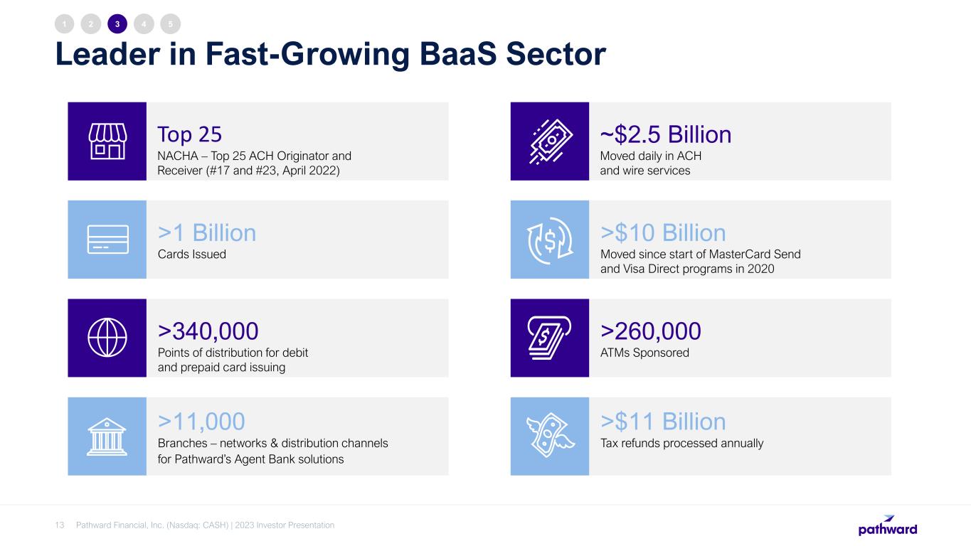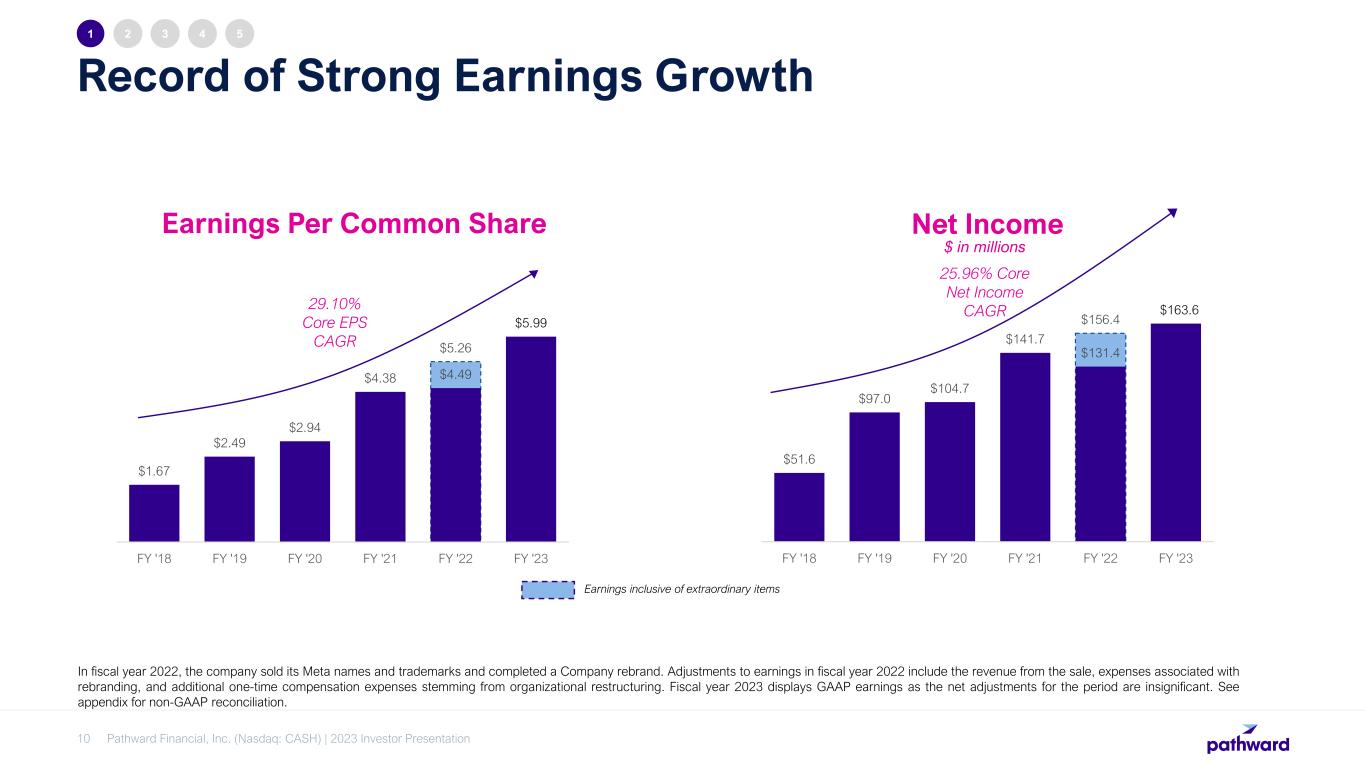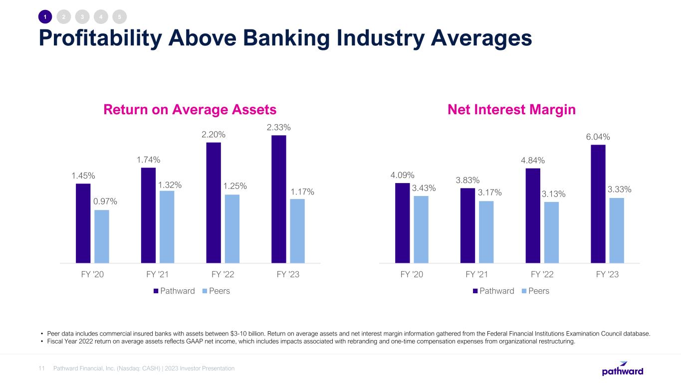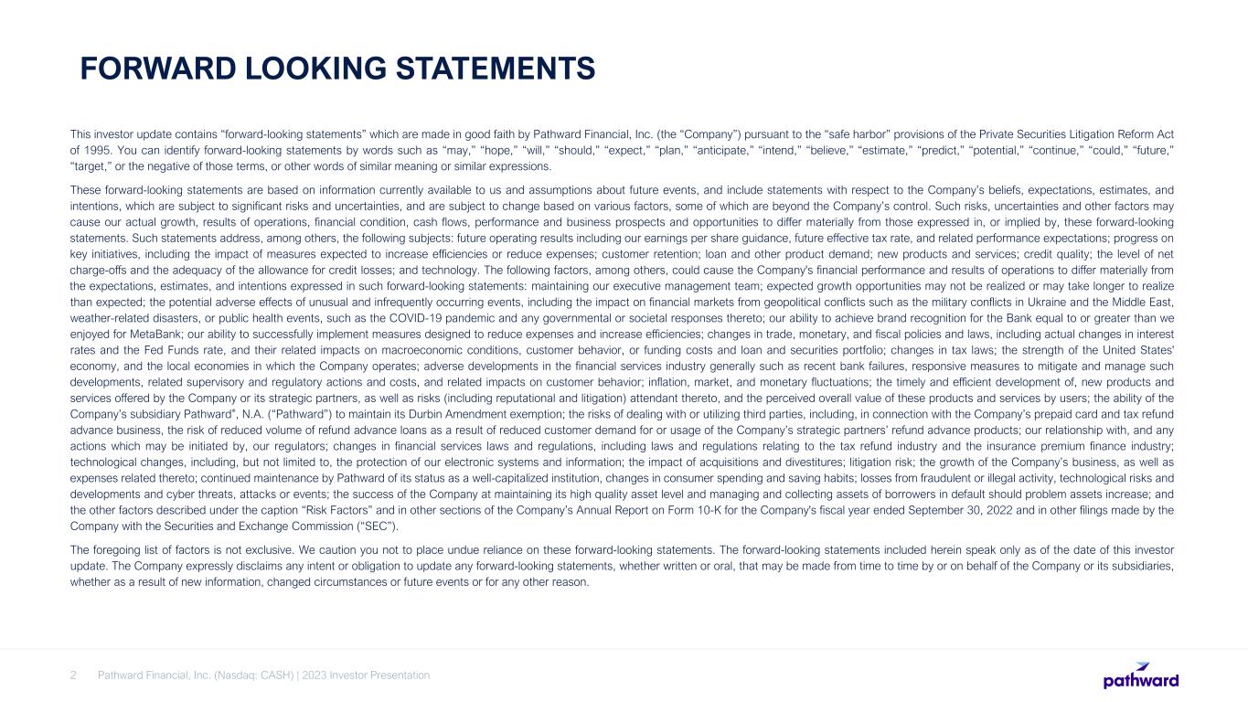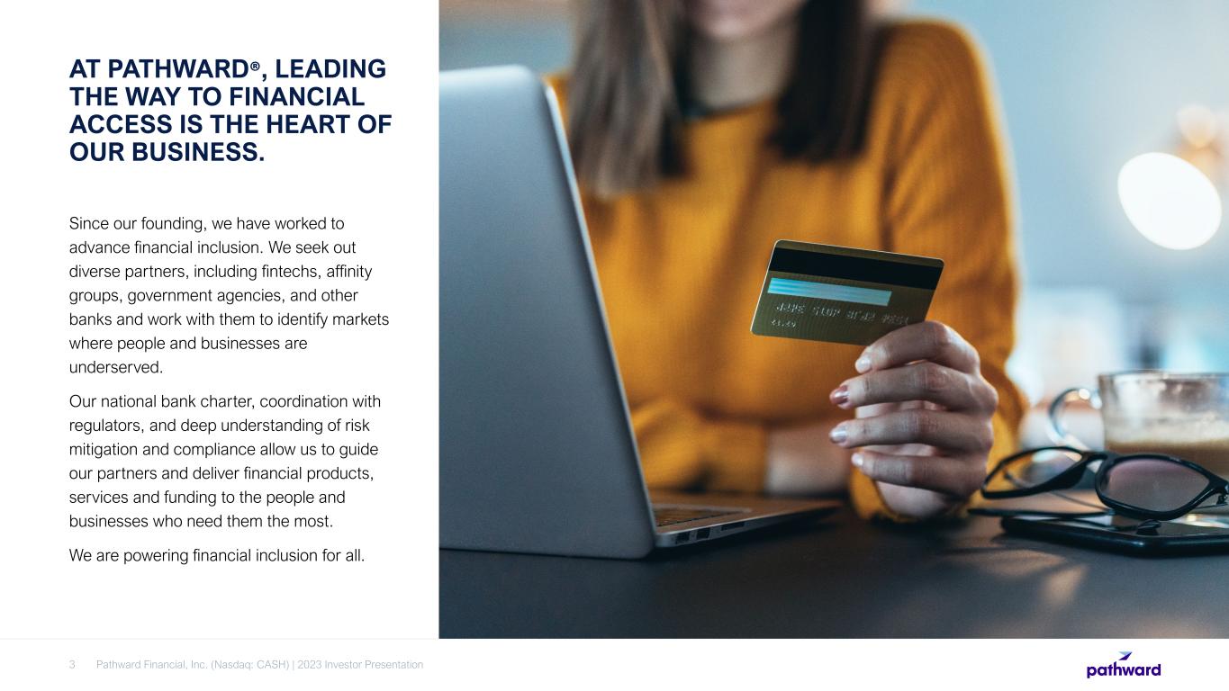 Pathward Financial, Inc. (Nasdaq: CASH) | 2023 Investor Presentation2 FORWARD LOOKING STATEMENTS This investor update contains “forward-looking statements” which are made in good faith by Pathward Financial, Inc. (the “Company”) pursuant to the “safe harbor” provisions of the Private Securities Litigation Reform Act of 1995. You can identify forward-looking statements by words such as “may,” “hope,” “will,” “should,” “expect,” “plan,” “anticipate,” “intend,” “believe,” “estimate,” “predict,” “potential,” “continue,” “could,” “future,” “target,” or the negative of those terms, or other words of similar meaning or similar expressions. These forward-looking statements are based on information currently available to us and assumptions about future events, and include statements with respect to the Company’s beliefs, expectations, estimates, and intentions, which are subject to significant risks and uncertainties, and are subject to change based on various factors, some of which are beyond the Company’s control. Such risks, uncertainties and other factors may cause our actual growth, results of operations, financial condition, cash flows, performance and business prospects and opportunities to differ materially from those expressed in, or implied by, these forward-looking statements. Such statements address, among others, the following subjects: future operating results including our earnings per share guidance, future effective tax rate, and related performance expectations; progress on key initiatives, including the impact of measures expected to increase efficiencies or reduce expenses; customer retention; loan and other product demand; new products and services; credit quality; the level of net charge-offs and the adequacy of the allowance for credit losses; and technology. The following factors, among others, could cause the Company's financial performance and results of operations to differ materially from the expectations, estimates, and intentions expressed in such forward-looking statements: maintaining our executive management team; expected growth opportunities may not be realized or may take longer to realize than expected; the potential adverse effects of unusual and infrequently occurring events, including the impact on financial markets from geopolitical conflicts such as the military conflicts in Ukraine and the Middle East, weather-related disasters, or public health events, such as the COVID-19 pandemic and any governmental or societal responses thereto; our ability to achieve brand recognition for the Bank equal to or greater than we enjoyed for MetaBank; our ability to successfully implement measures designed to reduce expenses and increase efficiencies; changes in trade, monetary, and fiscal policies and laws, including actual changes in interest rates and the Fed Funds rate, and their related impacts on macroeconomic conditions, customer behavior, or funding costs and loan and securities portfolio; changes in tax laws; the strength of the United States' economy, and the local economies in which the Company operates; adverse developments in the financial services industry generally such as recent bank failures, responsive measures to mitigate and manage such developments, related supervisory and regulatory actions and costs, and related impacts on customer behavior; inflation, market, and monetary fluctuations; the timely and efficient development of, new products and services offered by the Company or its strategic partners, as well as risks (including reputational and litigation) attendant thereto, and the perceived overall value of these products and services by users; the ability of the Company’s subsidiary Pathward®, N.A. (“Pathward”) to maintain its Durbin Amendment exemption; the risks of dealing with or utilizing third parties, including, in connection with the Company’s prepaid card and tax refund advance business, the risk of reduced volume of refund advance loans as a result of reduced customer demand for or usage of the Company’s strategic partners’ refund advance products; our relationship with, and any actions which may be initiated by, our regulators; changes in financial services laws and regulations, including laws and regulations relating to the tax refund industry and the insurance premium finance industry; technological changes, including, but not limited to, the protection of our electronic systems and information; the impact of acquisitions and divestitures; litigation risk; the growth of the Company’s business, as well as expenses related thereto; continued maintenance by Pathward of its status as a well-capitalized institution, changes in consumer spending and saving habits; losses from fraudulent or illegal activity, technological risks and developments and cyber threats, attacks or events; the success of the Company at maintaining its high quality asset level and managing and collecting assets of borrowers in default should problem assets increase; and the other factors described under the caption “Risk Factors” and in other sections of the Company’s Annual Report on Form 10-K for the Company's fiscal year ended September 30, 2022 and in other filings made by the Company with the Securities and Exchange Commission (“SEC”). The foregoing list of factors is not exclusive. We caution you not to place undue reliance on these forward-looking statements. The forward-looking statements included herein speak only as of the date of this investor update. The Company expressly disclaims any intent or obligation to update any forward-looking statements, whether written or oral, that may be made from time to time by or on behalf of the Company or its subsidiaries, whether as a result of new information, changed circumstances or future events or for any other reason.