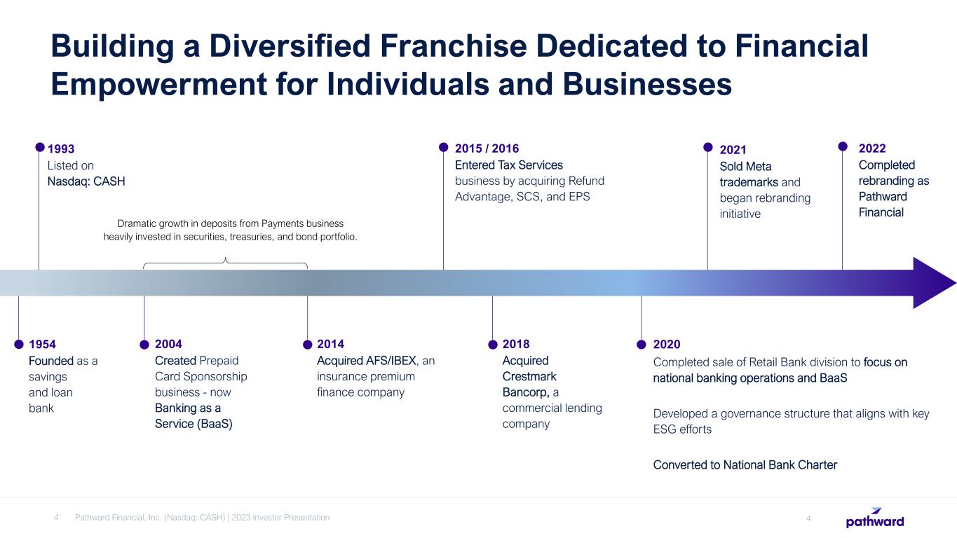 Since our founding, we have worked to advance financial inclusion. We seek out diverse partners, including fintechs, affinity groups, government agencies, and other banks and work with them to identify markets where people and businesses are underserved. Our national bank charter, coordination with regulators, and deep understanding of risk mitigation and compliance allow us to guide our partners and deliver financial products, services and funding to the people and businesses who need them the most. We are powering financial inclusion for all. AT PATHWARD®, LEADING THE WAY TO FINANCIAL ACCESS IS THE HEART OF OUR BUSINESS. 3 Pathward Financial, Inc. (Nasdaq: CASH) | 2023 Investor Presentation