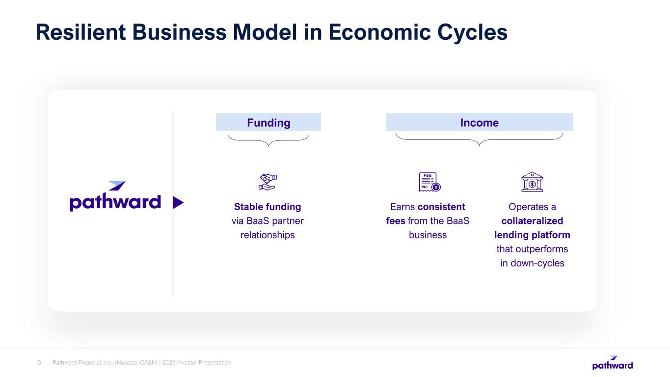 Building a Diversified Franchise Dedicated to Financial Empowerment for Individuals and Businesses 4 1993 Listed on Nasdaq: CASH 2015 / 2016 Entered Tax Services business by acquiring Refund Advantage, SCS, and EPS 2020 Completed sale of Retail Bank division to focus on national banking operations and BaaS Developed a governance structure that aligns with key ESG efforts Converted to National Bank Charter 2004 Created Prepaid Card Sponsorship business - now Banking as a Service (BaaS) 2014 Acquired AFS/IBEX, an insurance premium finance company 2018 Acquired Crestmark Bancorp, a commercial lending company Dramatic growth in deposits from Payments business heavily invested in securities, treasuries, and bond portfolio. 1954 Founded as a savings and loan bank 2021 Sold Meta trademarks and began rebranding initiative 2022 Completed rebranding as Pathward Financial Pathward Financial, Inc. (Nasdaq: CASH) | 2023 Investor Presentation4