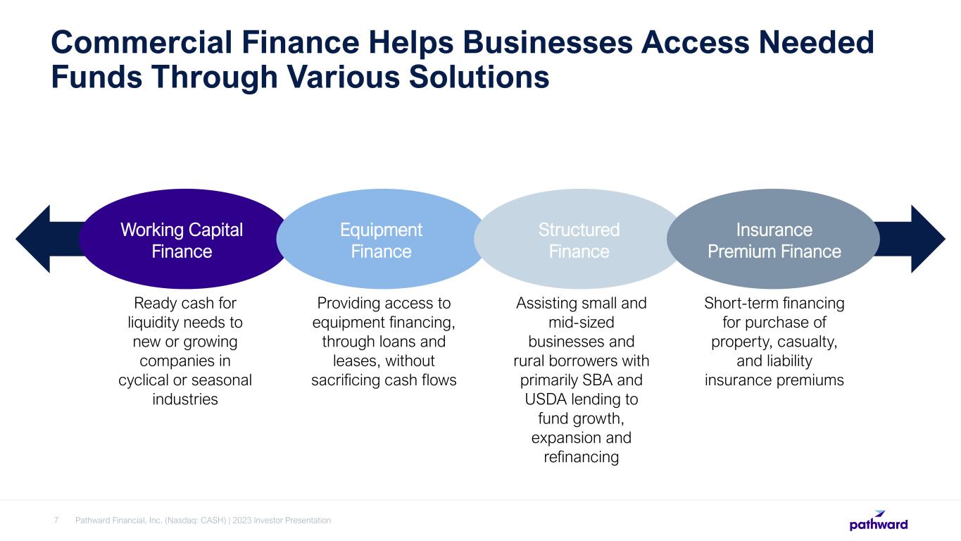 Pathward Financial, Inc. (Nasdaq: CASH) | 2023 Investor Presentation6 Collaborate With Partners to Provide Innovative Banking as a Service (BaaS) Solutions Payment Solutions Issuing Solutions Credit Solutions Tax Solutions Accepting and processing payments through highspeed banking rails A leading debit and prepaid card issuer holding funds for partner programs Enable partners’ lending solutions to serve diverse credit customer needs Partner with a network of tax preparers offering a variety of products