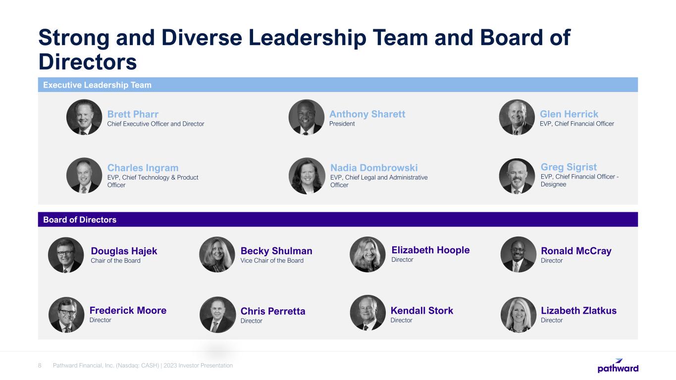 Pathward Financial, Inc. (Nasdaq: CASH) | 2023 Investor Presentation7 Commercial Finance Helps Businesses Access Needed Funds Through Various Solutions Working Capital Finance Equipment Finance Structured Finance Insurance Premium Finance Ready cash for liquidity needs to new or growing companies in cyclical or seasonal industries Providing access to equipment financing, through loans and leases, without sacrificing cash flows Assisting small and mid-sized businesses and rural borrowers with primarily SBA and USDA lending to fund growth, expansion and refinancing Short-term financing for purchase of property, casualty, and liability insurance premiums