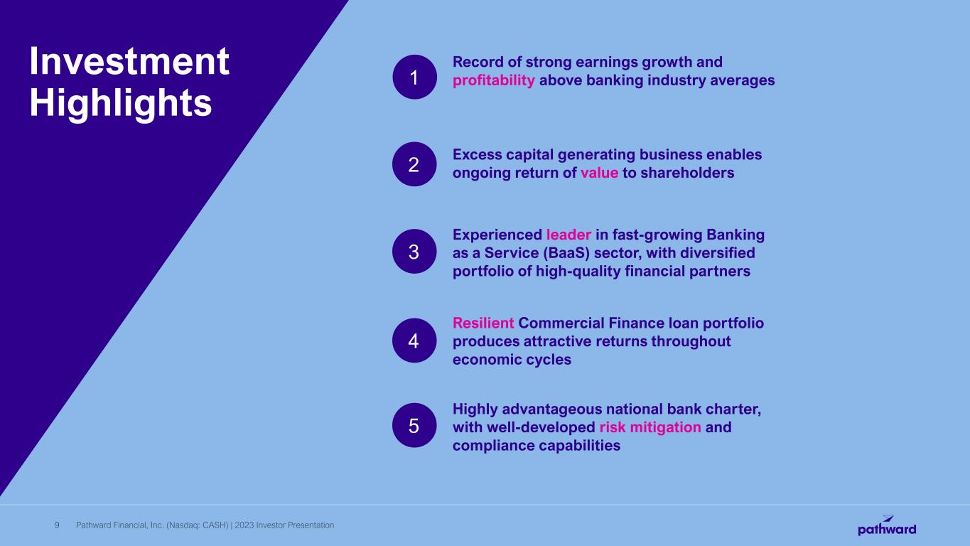 Strong and Diverse Leadership Team and Board of Directors 8 Pathward Financial, Inc. (Nasdaq: CASH) | 2023 Investor Presentation Executive Leadership Team Board of Directors Brett Pharr Chief Executive Officer and Director Anthony Sharett President Glen Herrick EVP, Chief Financial Officer Charles Ingram EVP, Chief Technology & Product Officer Nadia Dombrowski EVP, Chief Legal and Administrative Officer Douglas Hajek Chair of the Board Elizabeth Hoople Director Ronald McCray Director Frederick Moore Director Becky Shulman Vice Chair of the Board Kendall Stork Director Lizabeth Zlatkus Director Chris Perretta Director Greg Sigrist EVP, Chief Financial Officer - Designee