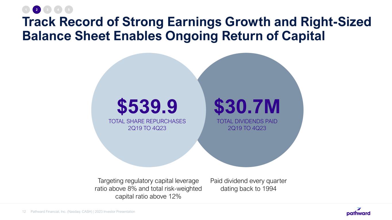 Profitability Above Banking Industry Averages Pathward Financial, Inc. (Nasdaq: CASH) | 2023 Investor Presentation11 1 2 3 4 5 • Peer data includes commercial insured banks with assets between $3-10 billion. Return on average assets and net interest margin information gathered from the Federal Financial Institutions Examination Council database. • Fiscal Year 2022 return on average assets reflects GAAP net income, which includes impacts associated with rebranding and one-time compensation expenses from organizational restructuring. 1.45% 1.74% 2.20% 2.33% 0.97% 1.32% 1.25% 1.17% FY '20 FY '21 FY '22 FY '23 Pathward Peers Return on Average Assets 4.09% 3.83% 4.84% 6.04% 3.43% 3.17% 3.13% 3.33% FY '20 FY '21 FY '22 FY '23 Pathward Peers Net Interest Margin