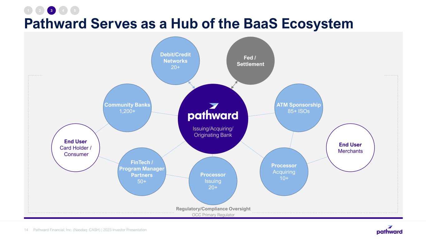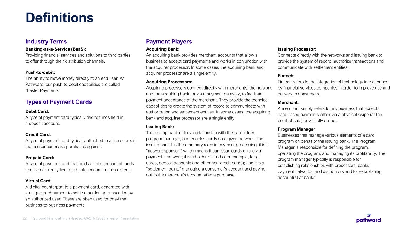Industry Terms 22 Types of Payment Cards Banking-as-a-Service (BaaS): Providing financial services and solutions to third parties to offer through their distribution channels. Push-to-debit: The ability to move money directly to an end user. At Pathward, our push-to-debit capabilities are called “Faster Payments”. Debit Card: A type of payment card typically tied to funds held in a deposit account. Credit Card: A type of payment card typically attached to a line of credit that a user can make purchases against. Prepaid Card: A type of payment card that holds a finite amount of funds and is not directly tied to a bank account or line of credit. Virtual Card: A digital counterpart to a payment card, generated with a unique card number to settle a particular transaction by an authorized user. These are often used for one-time, business-to-business payments. Pathward Financial, Inc. (Nasdaq: CASH) | 2023 Investor Presentation Payment Players Acquiring Bank: An acquiring bank provides merchant accounts that allow a business to accept card payments and works in conjunction with the acquirer processor. In some cases, the acquiring bank and acquirer processor are a single entity. Acquiring Processors: Acquiring processors connect directly with merchants, the network and the acquiring bank, or via a payment gateway, to facilitate payment acceptance at the merchant. They provide the technical capabilities to create the system of record to communicate with authorization and settlement entities. In some cases, the acquiring bank and acquirer processor are a single entity. Issuing Bank: The issuing bank enters a relationship with the cardholder, program manager, and enables cards on a given network. The issuing bank fills three primary roles in payment processing: it is a “network sponsor,” which means it can issue cards on a given payments network; it is a holder of funds (for example, for gift cards, deposit accounts and other non-credit cards); and it is a “settlement point,” managing a consumer’s account and paying out to the merchant’s account after a purchase. Issuing Processor: Connects directly with the networks and issuing bank to provide the system of record, authorize transactions and communicate with settlement entities. Fintech: Fintech refers to the integration of technology into offerings by financial services companies in order to improve use and delivery to consumers. Merchant: A merchant simply refers to any business that accepts card-based payments either via a physical swipe (at the point-of-sale) or virtually online. Program Manager: Businesses that manage various elements of a card program on behalf of the issuing bank. The Program Manager is responsible for defining the program, operating the program, and managing its profitability. The program manager typically is responsible for establishing relationships with processors, banks, payment networks, and distributors and for establishing account(s) at banks. Definitions