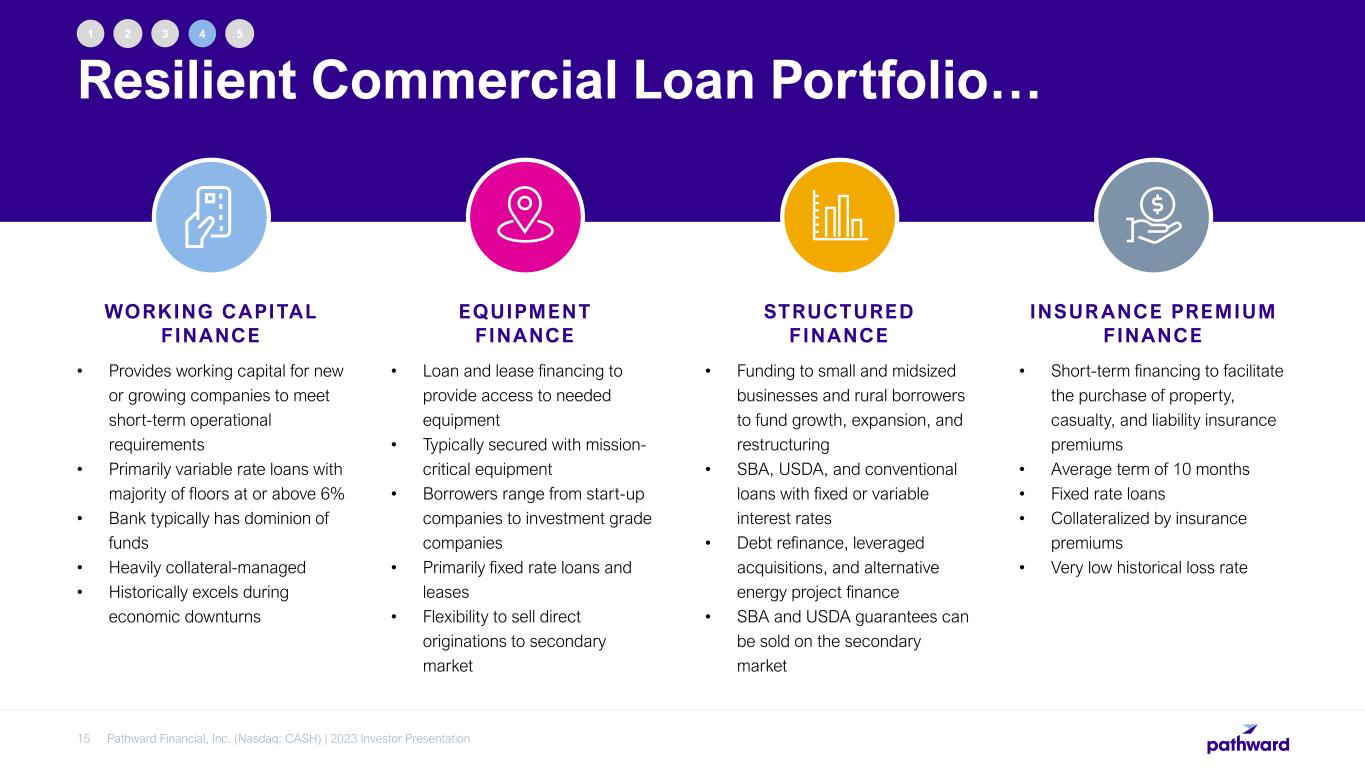 Pathward Financial, Inc. (Nasdaq: CASH) | 2023 Investor Presentation15 Resilient Commercial Loan Portfolio… WORKING CAPITAL FINANCE • Provides working capital for new or growing companies to meet short-term operational requirements • Primarily variable rate loans with majority of floors at or above 6% • Bank typically has dominion of funds • Heavily collateral-managed • Historically excels during economic downturns EQUIPMENT FINANCE • Loan and lease financing to provide access to needed equipment • Typically secured with mission- critical equipment • Borrowers range from start-up companies to investment grade companies • Primarily fixed rate loans and leases • Flexibility to sell direct originations to secondary market STRUCTURED FINANCE • Funding to small and midsized businesses and rural borrowers to fund growth, expansion, and restructuring • SBA, USDA, and conventional loans with fixed or variable interest rates • Debt refinance, leveraged acquisitions, and alternative energy project finance • SBA and USDA guarantees can be sold on the secondary market INSUR ANCE PREMIUM FINANCE • Short-term financing to facilitate the purchase of property, casualty, and liability insurance premiums • Average term of 10 months • Fixed rate loans • Collateralized by insurance premiums • Very low historical loss rate 1 2 3 4 5