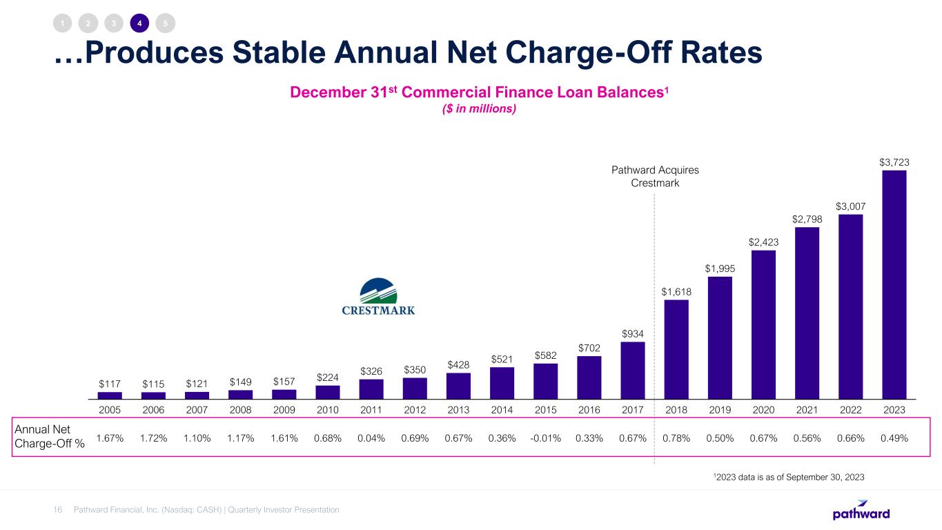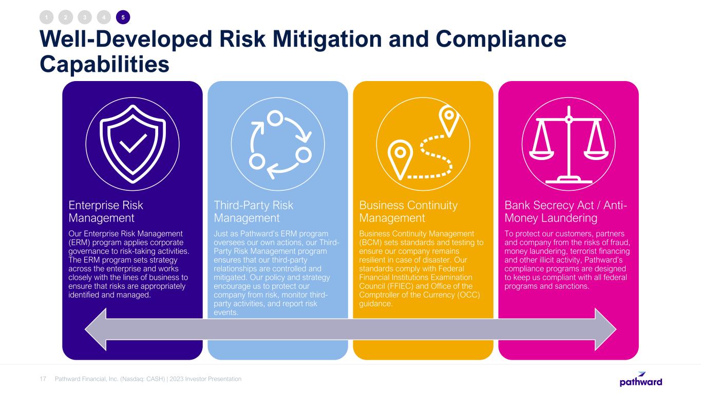 …Produces Stable Annual Net Charge-Off Rates Pathward Financial, Inc. (Nasdaq: CASH) | Quarterly Investor Presentation16 Pathward Acquires Crestmark December 31st Commercial Finance Loan Balances1 ($ in millions) $117 $115 $121 $149 $157 $224 $326 $350 $428 $521 $582 $702 $934 $1,618 $1,995 $2,423 $2,798 $3,007 $3,723 0.0 0.1 0.2 0.3 0.4 0.5 0.6 0.7 0.8 0.9 1.0 0 500 1,000 1,500 2,000 2,500 3,000 3,500 4,000 2005 1.67% 2006 1.72% 2007 1.10% 2008 1.17% 2009 1.61% 2010 0.68% 2011 0.04% 2012 0.69% 2013 0.67% 2014 0.36% 2015 -0.01% 2016 0.33% 2017 0.67% 2018 0.78% 2019 0.50% 2020 0.67% 2021 0.56% 2022 0.66% 2023 0.49% Annual Net Charge-Off % 1 2 3 4 5 12023 data is as of September 30, 2023
