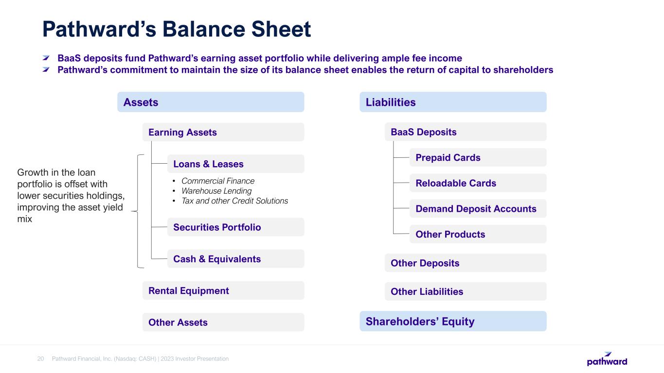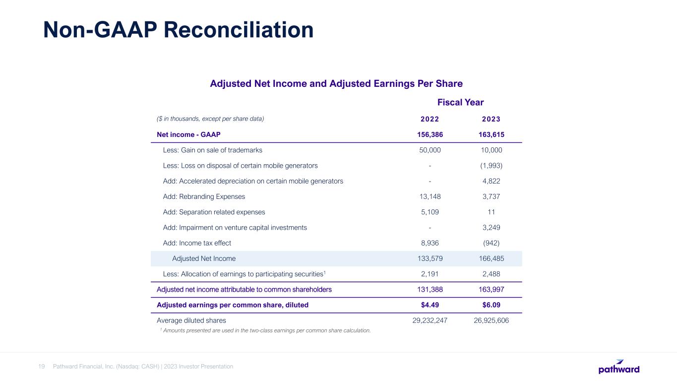 Pathward Financial, Inc. (Nasdaq: CASH) | 2023 Investor Presentation19 Adjusted Net Income and Adjusted Earnings Per Share Fiscal Year ($ in thousands, except per share data) 2022 2023 Net income - GAAP 156,386 163,615 Less: Gain on sale of trademarks 50,000 10,000 Less: Loss on disposal of certain mobile generators - (1,993) Add: Accelerated depreciation on certain mobile generators - 4,822 Add: Rebranding Expenses 13,148 3,737 Add: Separation related expenses 5,109 11 Add: Impairment on venture capital investments - 3,249 Add: Income tax effect 8,936 (942) Adjusted Net Income 133,579 166,485 Less: Allocation of earnings to participating securities1 2,191 2,488 Adjusted net income attributable to common shareholders 131,388 163,997 Adjusted earnings per common share, diluted $4.49 $6.09 Average diluted shares 29,232,247 26,925,606 1 Amounts presented are used in the two-class earnings per common share calculation. Non-GAAP Reconciliation