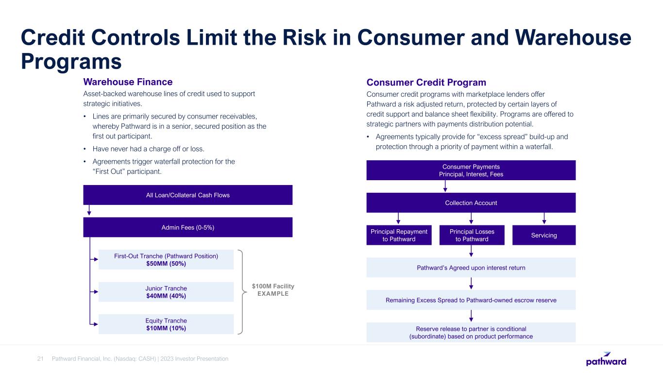 Pathward Financial, Inc. (Nasdaq: CASH) | 2023 Investor Presentation21 Credit Controls Limit the Risk in Consumer and Warehouse Programs All Loan/Collateral Cash Flows Admin Fees (0-5%) Junior Tranche $40MM (40%) Equity Tranche $10MM (10%) First-Out Tranche (Pathward Position) $50MM (50%) $100M Facility EXAMPLE Warehouse Finance Asset-backed warehouse lines of credit used to support strategic initiatives. • Lines are primarily secured by consumer receivables, whereby Pathward is in a senior, secured position as the first out participant. • Have never had a charge off or loss. • Agreements trigger waterfall protection for the “First Out” participant. Consumer Payments Principal, Interest, Fees Collection Account Servicing Principal Losses to Pathward Principal Repayment to Pathward Pathward’s Agreed upon interest return Remaining Excess Spread to Pathward-owned escrow reserve Reserve release to partner is conditional (subordinate) based on product performance Consumer Credit Program Consumer credit programs with marketplace lenders offer Pathward a risk adjusted return, protected by certain layers of credit support and balance sheet flexibility. Programs are offered to strategic partners with payments distribution potential. • Agreements typically provide for “excess spread” build-up and protection through a priority of payment within a waterfall.