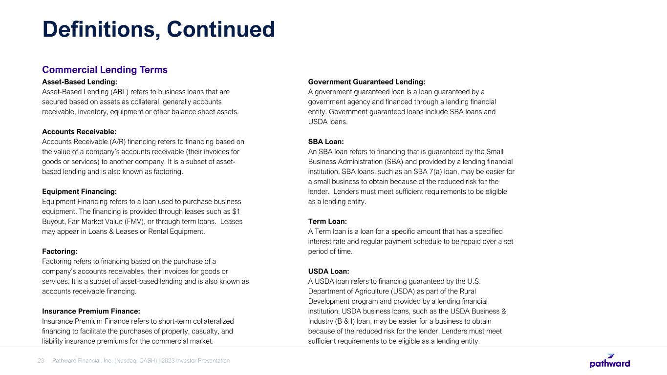 23 Asset-Based Lending: Asset-Based Lending (ABL) refers to business loans that are secured based on assets as collateral, generally accounts receivable, inventory, equipment or other balance sheet assets. Accounts Receivable: Accounts Receivable (A/R) financing refers to financing based on the value of a company’s accounts receivable (their invoices for goods or services) to another company. It is a subset of asset- based lending and is also known as factoring. Equipment Financing: Equipment Financing refers to a loan used to purchase business equipment. The financing is provided through leases such as $1 Buyout, Fair Market Value (FMV), or through term loans. Leases may appear in Loans & Leases or Rental Equipment. Factoring: Factoring refers to financing based on the purchase of a company’s accounts receivables, their invoices for goods or services. It is a subset of asset-based lending and is also known as accounts receivable financing. Insurance Premium Finance: Insurance Premium Finance refers to short-term collateralized financing to facilitate the purchases of property, casualty, and liability insurance premiums for the commercial market. Government Guaranteed Lending: A government guaranteed loan is a loan guaranteed by a government agency and financed through a lending financial entity. Government guaranteed loans include SBA loans and USDA loans. SBA Loan: An SBA loan refers to financing that is guaranteed by the Small Business Administration (SBA) and provided by a lending financial institution. SBA loans, such as an SBA 7(a) loan, may be easier for a small business to obtain because of the reduced risk for the lender. Lenders must meet sufficient requirements to be eligible as a lending entity. Term Loan: A Term loan is a loan for a specific amount that has a specified interest rate and regular payment schedule to be repaid over a set period of time. USDA Loan: A USDA loan refers to financing guaranteed by the U.S. Department of Agriculture (USDA) as part of the Rural Development program and provided by a lending financial institution. USDA business loans, such as the USDA Business & Industry (B & I) loan, may be easier for a business to obtain because of the reduced risk for the lender. Lenders must meet sufficient requirements to be eligible as a lending entity. Pathward Financial, Inc. (Nasdaq: CASH) | 2023 Investor Presentation Commercial Lending Terms Definitions, Continued