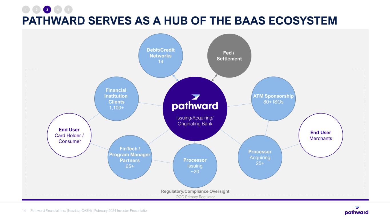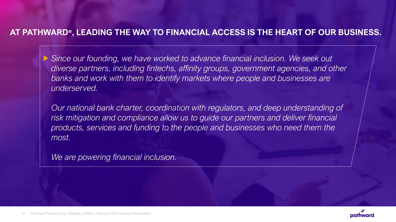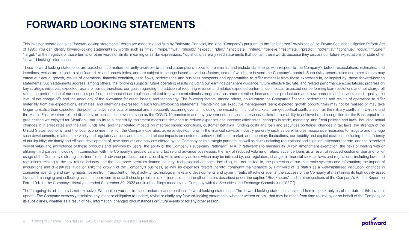 Pathward Financial, Inc. (Nasdaq: CASH) | February 2024 Investor Presentation2 FORWARD LOOKING STATEMENTS This investor update contains “forward-looking statements” which are made in good faith by Pathward Financial, Inc. (the “Company”) pursuant to the “safe harbor” provisions of the Private Securities Litigation Reform Act of 1995. You can identify forward-looking statements by words such as “may,” “hope,” “will,” “should,” “expect,” “plan,” “anticipate,” “intend,” “believe,” “estimate,” “predict,” “potential,” “continue,” “could,” “future,” “target,” or the negative of those terms, or other words of similar meaning or similar expressions. You should carefully read statements that contain these words because they discuss our future expectations or state other “forward-looking” information. These forward-looking statements are based on information currently available to us and assumptions about future events, and include statements with respect to the Company’s beliefs, expectations, estimates, and intentions, which are subject to significant risks and uncertainties, and are subject to change based on various factors, some of which are beyond the Company’s control. Such risks, uncertainties and other factors may cause our actual growth, results of operations, financial condition, cash flows, performance and business prospects and opportunities to differ materially from those expressed in, or implied by, these forward-looking statements. Such statements address, among others, the following subjects: future operating results including our earnings per share guidance, future effective tax rate, and related performance expectations; progress on key strategic initiatives; expected results of our partnerships; our goals regarding the addition of recurring revenue and related expected performance impacts; expected nonperforming loan resolutions and net charge-off rates; the performance of our securities portfolio; the impact of card balances related to government stimulus programs; customer retention; loan and other product demand; new products and services; credit quality; the level of net charge-offs and the adequacy of the allowance for credit losses; and technology. The following factors, among others, could cause the Company's financial performance and results of operations to differ materially from the expectations, estimates, and intentions expressed in such forward-looking statements: maintaining our executive management team; expected growth opportunities may not be realized or may take longer to realize than expected; the potential adverse effects of unusual and infrequently occurring events, including the impact on financial markets from geopolitical conflicts such as the military conflicts in Ukraine and the Middle East, weather-related disasters, or public health events, such as the COVID-19 pandemic and any governmental or societal responses thereto; our ability to achieve brand recognition for the Bank equal to or greater than we enjoyed for MetaBank; our ability to successfully implement measures designed to reduce expenses and increase efficiencies; changes in trade, monetary, and fiscal policies and laws, including actual changes in interest rates and the Fed Funds rate, and their related impacts on macroeconomic conditions, customer behavior, funding costs and loan and securities portfolios; changes in tax laws; the strength of the United States' economy, and the local economies in which the Company operates; adverse developments in the financial services industry generally such as bank failures, responsive measures to mitigate and manage such developments, related supervisory and regulatory actions and costs, and related impacts on customer behavior; inflation, market, and monetary fluctuations; our liquidity and capital positions, including the sufficiency of our liquidity; the timely and efficient development of, new products and services offered by the Company or its strategic partners, as well as risks (including reputational and litigation) attendant thereto, and the perceived overall value and acceptance of these products and services by users; the ability of the Company’s subsidiary Pathward®, N.A. (“Pathward”) to maintain its Durbin Amendment exemption; the risks of dealing with or utilizing third parties, including, in connection with the Company’s prepaid card and tax refund advance businesses, the risk of reduced volume of refund advance loans as a result of reduced customer demand for or usage of the Company’s strategic partners’ refund advance products; our relationship with, and any actions which may be initiated by, our regulators; changes in financial services laws and regulations, including laws and regulations relating to the tax refund industry and the insurance premium finance industry; technological changes, including, but not limited to, the protection of our electronic systems and information; the impact of acquisitions and divestitures; litigation risk; the growth of the Company’s business, as well as expenses related thereto; continued maintenance by Pathward of its status as a well-capitalized institution, changes in consumer spending and saving habits; losses from fraudulent or illegal activity, technological risks and developments and cyber threats, attacks or events; the success of the Company at maintaining its high quality asset level and managing and collecting assets of borrowers in default should problem assets increase; and the other factors described under the caption “Risk Factors” and in other sections of the Company’s Annual Report on Form 10-K for the Company's fiscal year ended September 30, 2023 and in other filings made by the Company with the Securities and Exchange Commission (“SEC”). The foregoing list of factors is not exclusive. We caution you not to place undue reliance on these forward-looking statements. The forward-