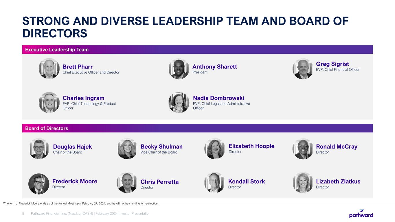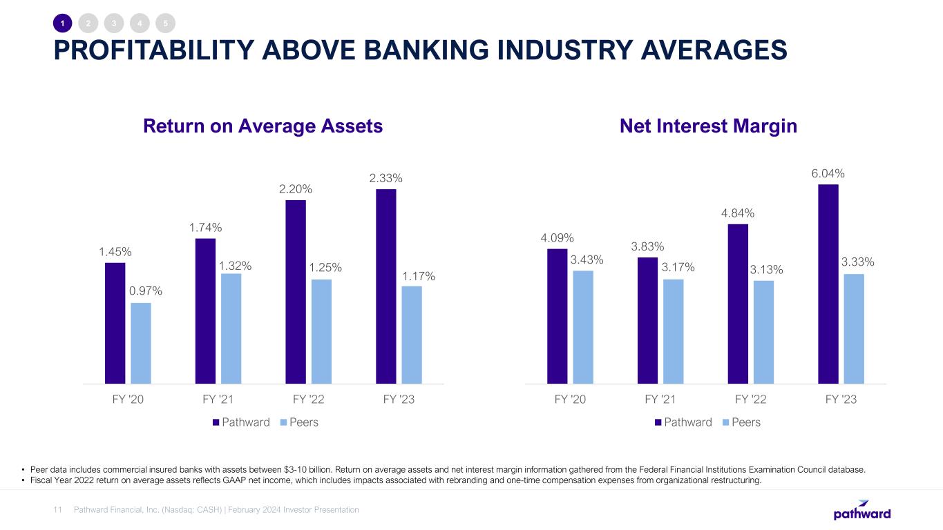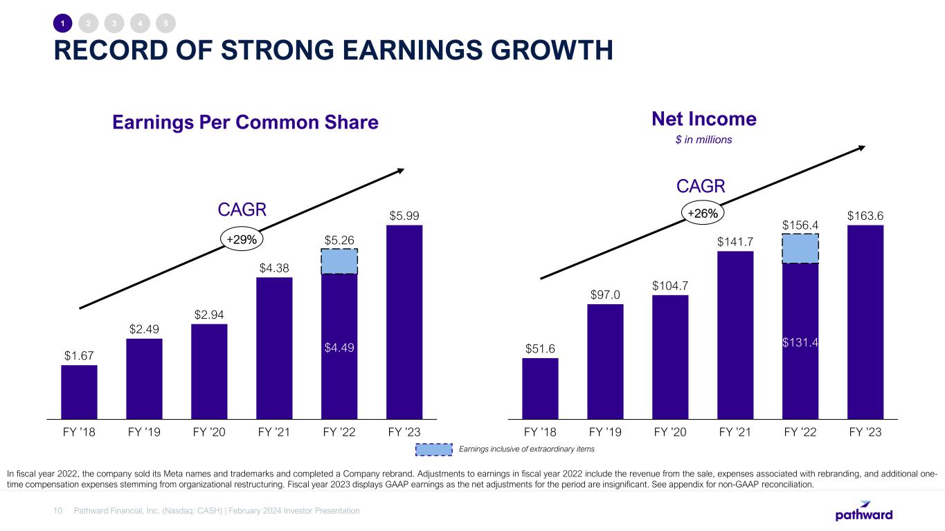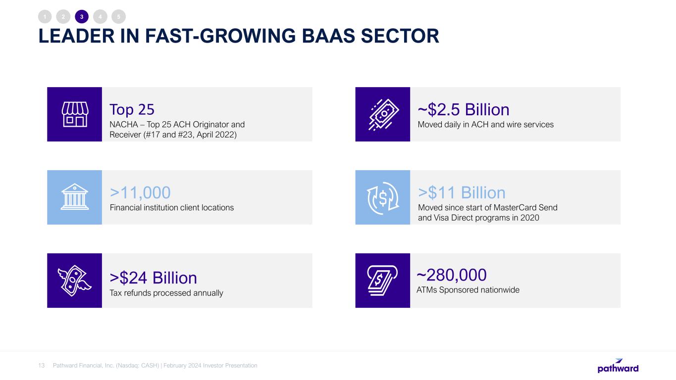 Pathward Financial, Inc. (Nasdaq: CASH) | February 2024 Investor Presentation2 FORWARD LOOKING STATEMENTS This investor update contains “forward-looking statements” which are made in good faith by Pathward Financial, Inc. (the “Company”) pursuant to the “safe harbor” provisions of the Private Securities Litigation Reform Act of 1995. You can identify forward-looking statements by words such as “may,” “hope,” “will,” “should,” “expect,” “plan,” “anticipate,” “intend,” “believe,” “estimate,” “predict,” “potential,” “continue,” “could,” “future,” “target,” or the negative of those terms, or other words of similar meaning or similar expressions. You should carefully read statements that contain these words because they discuss our future expectations or state other “forward-looking” information. These forward-looking statements are based on information currently available to us and assumptions about future events, and include statements with respect to the Company’s beliefs, expectations, estimates, and intentions, which are subject to significant risks and uncertainties, and are subject to change based on various factors, some of which are beyond the Company’s control. Such risks, uncertainties and other factors may cause our actual growth, results of operations, financial condition, cash flows, performance and business prospects and opportunities to differ materially from those expressed in, or implied by, these forward-looking statements. Such statements address, among others, the following subjects: future operating results including our earnings per share guidance, future effective tax rate, and related performance expectations; progress on key strategic initiatives; expected results of our partnerships; our goals regarding the addition of recurring revenue and related expected performance impacts; expected nonperforming loan resolutions and net charge-off rates; the performance of our securities portfolio; the impact of card balances related to government stimulus programs; customer retention; loan and other product demand; new products and services; credit quality; the level of net charge-offs and the adequacy of the allowance for credit losses; and technology. The following factors, among others, could cause the Company's financial performance and results of operations to differ materially from the expectations, estimates, and intentions expressed in such forward-looking statements: maintaining our executive management team; expected growth opportunities may not be realized or may take longer to realize than expected; the potential adverse effects of unusual and infrequently occurring events, including the impact on financial markets from geopolitical conflicts such as the military conflicts in Ukraine and the Middle East, weather-related disasters, or public health events, such as the COVID-19 pandemic and any governmental or societal responses thereto; our ability to achieve brand recognition for the Bank equal to or greater than we enjoyed for MetaBank; our ability to successfully implement measures designed to reduce expenses and increase efficiencies; changes in trade, monetary, and fiscal policies and laws, including actual changes in interest rates and the Fed Funds rate, and their related impacts on macroeconomic conditions, customer behavior, funding costs and loan and securities portfolios; changes in tax laws; the strength of the United States' economy, and the local economies in which the Company operates; adverse developments in the financial services industry generally such as bank failures, responsive measures to mitigate and manage such developments, related supervisory and regulatory actions and costs, and related impacts on customer behavior; inflation, market, and monetary fluctuations; our liquidity and capital positions, including the sufficiency of our liquidity; the timely and efficient development of, new products and services offered by the Company or its strategic partners, as well as risks (including reputational and litigation) attendant thereto, and the perceived overall value and acceptance of these products and services by users; the ability of the Company’s subsidiary Pathward®, N.A. (“Pathward”) to maintain its Durbin Amendment exemption; the risks of dealing with or utilizing third parties, including, in connection with the Company’s prepaid card and tax refund advance businesses, the risk of reduced volume of refund advance loans as a result of reduced customer demand for or usage of the Company’s strategic partners’ refund advance products; our relationship with, and any actions which may be initiated by, our regulators; changes in financial services laws and regulations, including laws and regulations relating to the tax refund industry and the insurance premium finance industry; technological changes, including, but not limited to, the protection of our electronic systems and information; the impact of acquisitions and divestitures; litigation risk; the growth of the Company’s business, as well as expenses related thereto; continued maintenance by Pathward of its status as a well-capitalized institution, changes in consumer spending and saving habits; losses from fraudulent or illegal activity, technological risks and developments and cyber threats, attacks or events; the success of the Company at maintaining its high quality asset level and managing and collecting assets of borrowers in default should problem assets increase; and the other factors described under the caption “Risk Factors” and in other sections of the Company’s Annual Report on Form 10-K for the Company's fiscal year ended September 30, 2023 and in other filings made by the Company with the Securities and Exchange Commission (“SEC”). The foregoing list of factors is not exclusive. We caution you not to place undue reliance on these forward-looking statements. The forward-