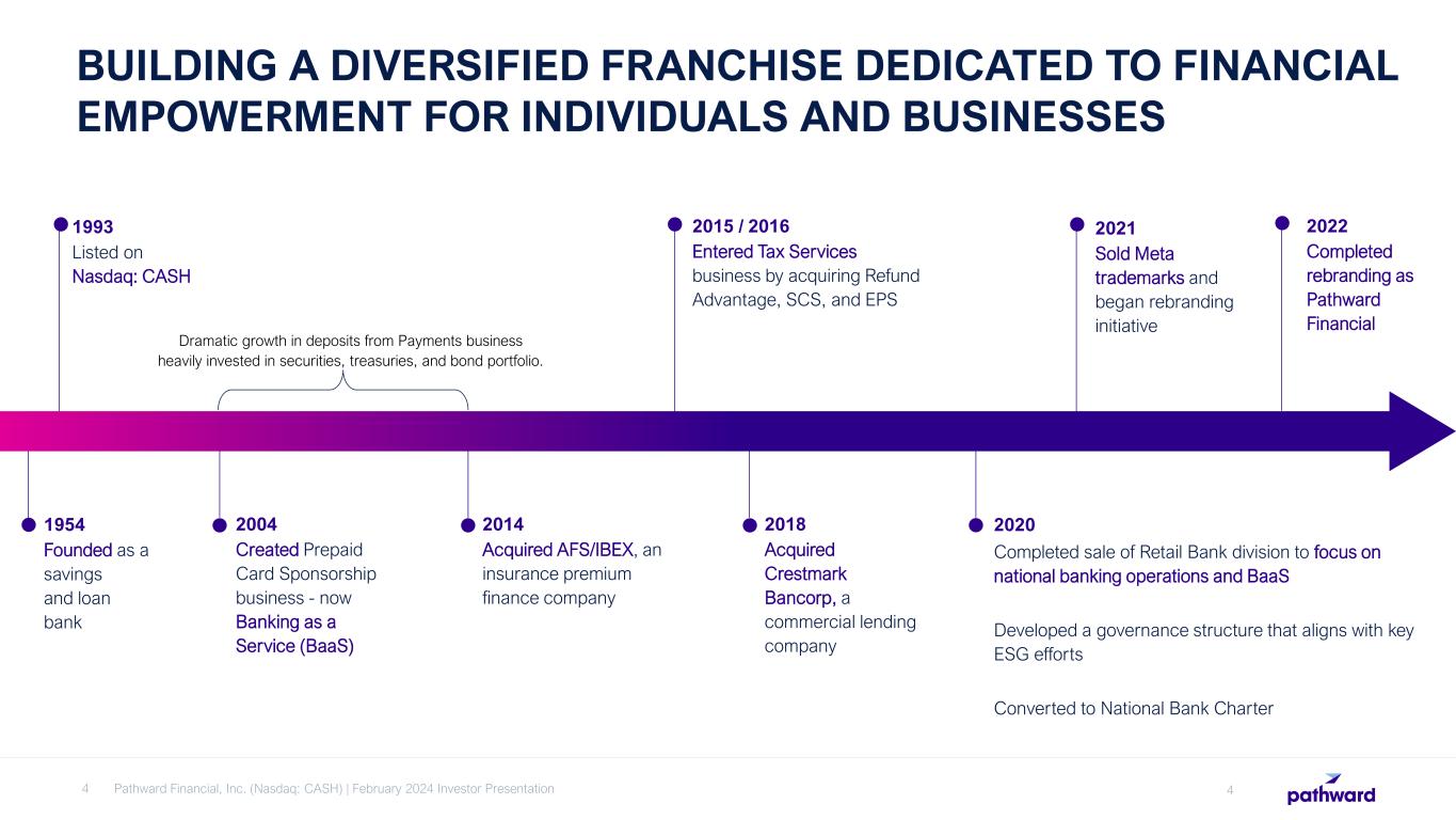 Since our founding, we have worked to advance financial inclusion. We seek out diverse partners, including fintechs, affinity groups, government agencies, and other banks and work with them to identify markets where people and businesses are underserved. Our national bank charter, coordination with regulators, and deep understanding of risk mitigation and compliance allow us to guide our partners and deliver financial products, services and funding to the people and businesses who need them the most. We are powering financial inclusion. AT PATHWARD®, LEADING THE WAY TO FINANCIAL ACCESS IS THE HEART OF OUR BUSINESS. 3 Pathward Financial, Inc. (Nasdaq: CASH) | February 2024 Investor Presentation