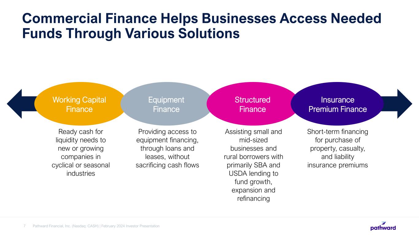 6 COLLABORATE WITH PARTNERS TO PROVIDE INNOVATIVE BANKING AS A SERVICE (BAAS) SOLUTIONS Payment Solutions Issuing Solutions Credit Solutions Tax Solutions Accepting and processing payments through highspeed banking rails A leading debit and prepaid card issuer holding funds for partner programs Enable partners’ lending solutions to serve diverse credit customer needs Partner with a network of tax preparers offering a variety of products Pathward Financial, Inc. (Nasdaq: CASH) | February 2024 Investor Presentation