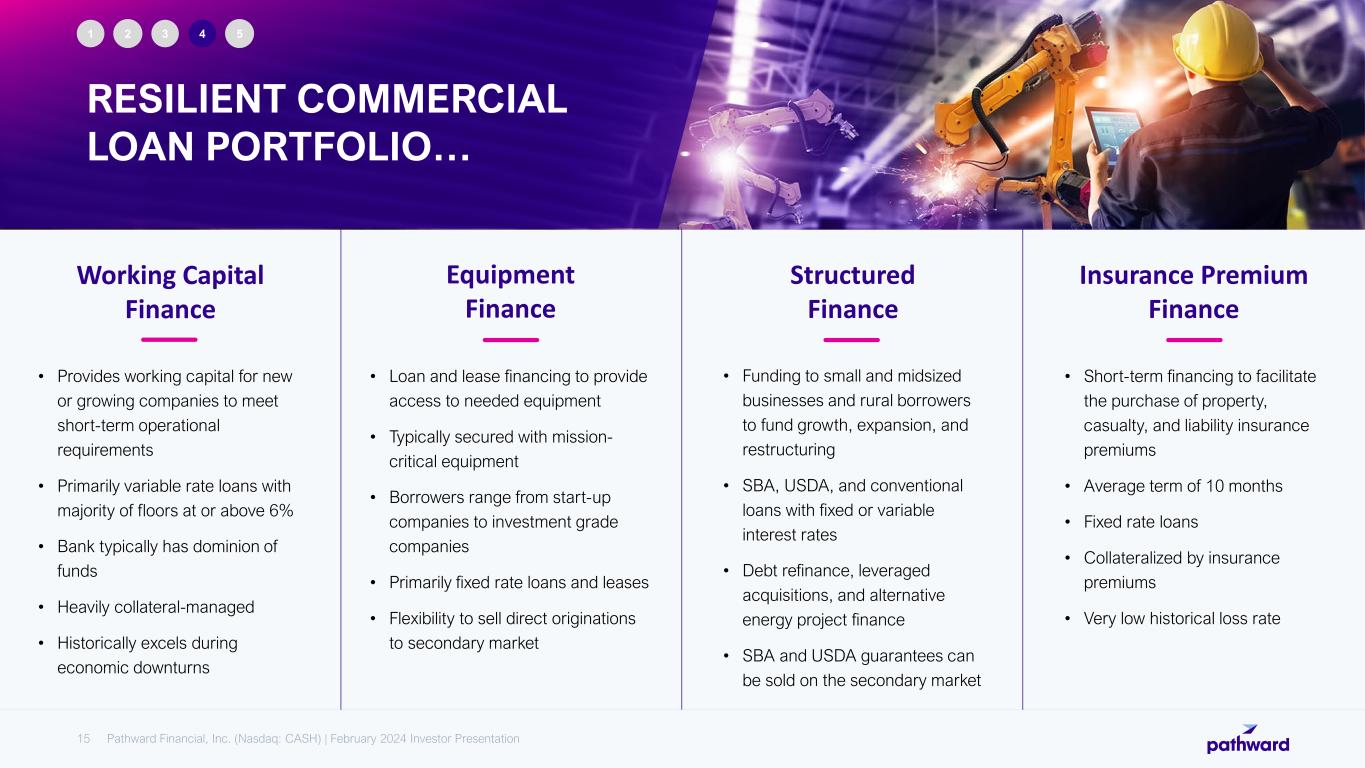 23 Asset-Based Lending: Asset-Based Lending (ABL) refers to business loans that are secured based on assets as collateral, generally accounts receivable, inventory, equipment or other balance sheet assets. Accounts Receivable: Accounts Receivable (A/R) financing refers to financing based on the value of a company’s accounts receivable (their invoices for goods or services) to another company. It is a subset of asset- based lending and is also known as factoring. Equipment Financing: Equipment Financing refers to a loan used to purchase business equipment. The financing is provided through leases such as $1 Buyout, Fair Market Value (FMV), or through term loans. Leases may appear in Loans & Leases or Rental Equipment. Factoring: Factoring refers to financing based on the purchase of a company’s accounts receivables, their invoices for goods or services. It is a subset of asset-based lending and is also known as accounts receivable financing. Insurance Premium Finance: Insurance Premium Finance refers to short-term collateralized financing to facilitate the purchases of property, casualty, and liability insurance premiums for the commercial market. Government Guaranteed Lending: A government guaranteed loan is a loan guaranteed by a government agency and financed through a lending financial entity. Government guaranteed loans include SBA loans and USDA loans. SBA Loan: An SBA loan refers to financing that is guaranteed by the Small Business Administration (SBA) and provided by a lending financial institution. SBA loans, such as an SBA 7(a) loan, may be easier for a small business to obtain because of the reduced risk for the lender. Lenders must meet sufficient requirements to be eligible as a lending entity. Term Loan: A Term loan is a loan for a specific amount that has a specified interest rate and regular payment schedule to be repaid over a set period of time. USDA Loan: A USDA loan refers to financing guaranteed by the U.S. Department of Agriculture (USDA) as part of the Rural Development program and provided by a lending financial institution. USDA business loans, such as the USDA Business & Industry (B & I) loan, may be easier for a business to obtain because of the reduced risk for the lender. Lenders must meet sufficient requirements to be eligible as a lending entity. Commercial Lending Terms Definitions, Continued Pathward Financial, Inc. (Nasdaq: CASH) | February 2024 Investor Presentation