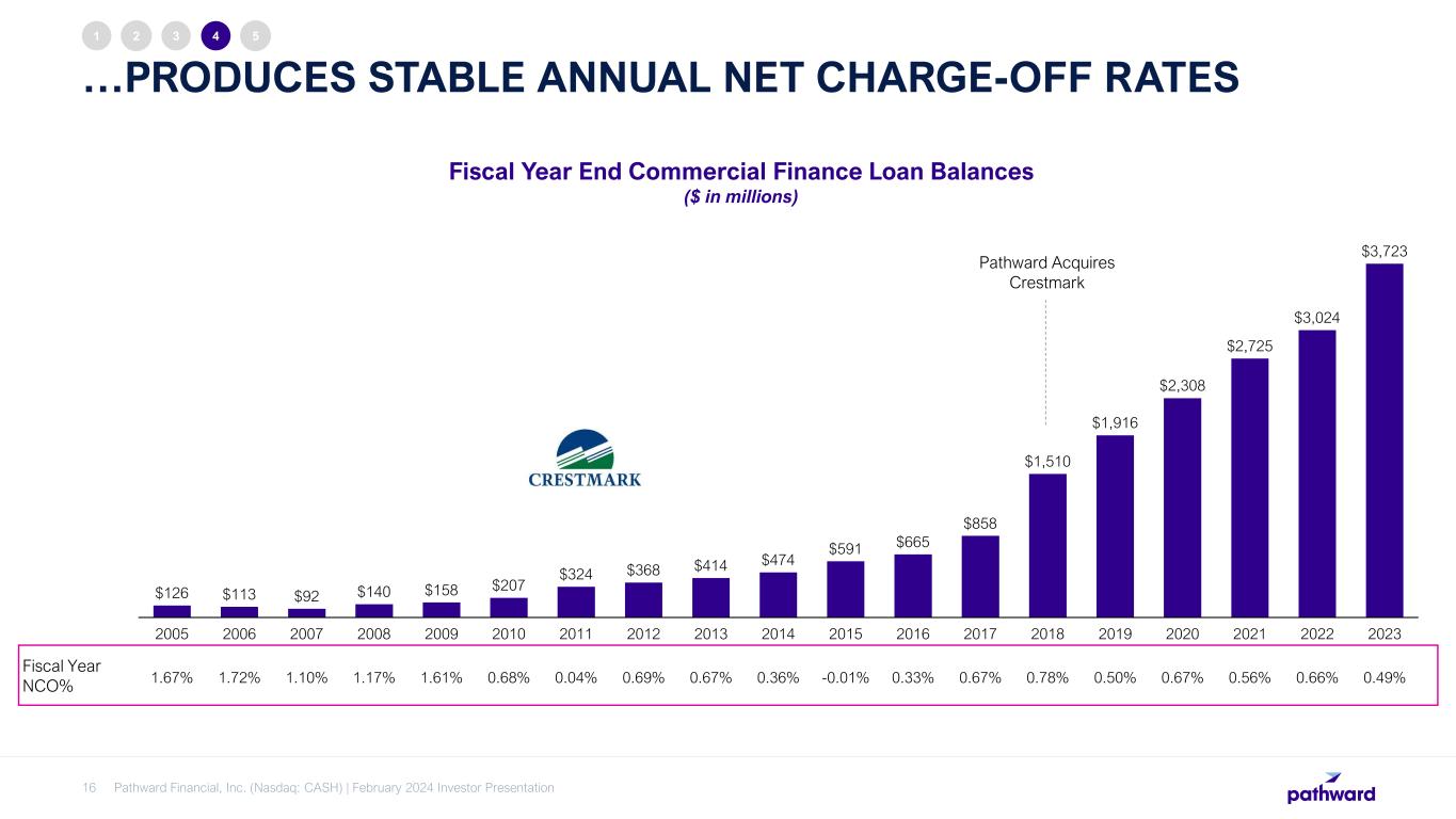 Working Capital Finance • Provides working capital for new or growing companies to meet short-term operational requirements • Primarily variable rate loans with majority of floors at or above 6% • Bank typically has dominion of funds • Heavily collateral-managed • Historically excels during economic downturns Equipment Finance • Loan and lease financing to provide access to needed equipment • Typically secured with mission- critical equipment • Borrowers range from start-up companies to investment grade companies • Primarily fixed rate loans and leases • Flexibility to sell direct originations to secondary market Structured Finance • Funding to small and midsized businesses and rural borrowers to fund growth, expansion, and restructuring • SBA, USDA, and conventional loans with fixed or variable interest rates • Debt refinance, leveraged acquisitions, and alternative energy project finance • SBA and USDA guarantees can be sold on the secondary market Insurance Premium Finance • Short-term financing to facilitate the purchase of property, casualty, and liability insurance premiums • Average term of 10 months • Fixed rate loans • Collateralized by insurance premiums • Very low historical loss rate RESILIENT COMMERCIAL LOAN PORTFOLIO… 15 1 2 3 4 5 Pathward Financial, Inc. (Nasdaq: CASH) | February 2024 Investor Presentation