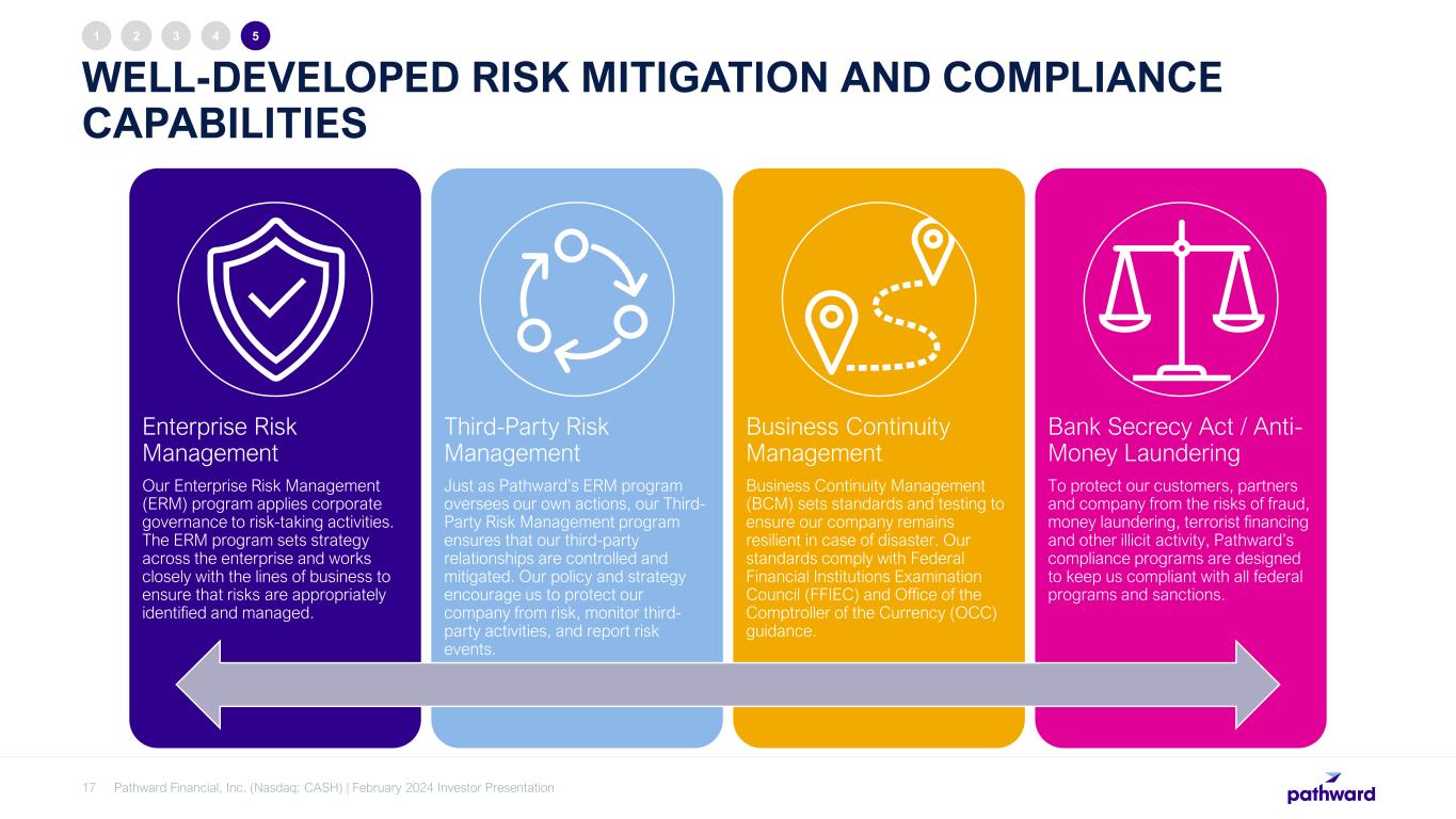 BUILDING A DIVERSIFIED FRANCHISE DEDICATED TO FINANCIAL EMPOWERMENT FOR INDIVIDUALS AND BUSINESSES 4 1993 Listed on Nasdaq: CASH 2015 / 2016 Entered Tax Services business by acquiring Refund Advantage, SCS, and EPS 2020 Completed sale of Retail Bank division to focus on national banking operations and BaaS Developed a governance structure that aligns with key ESG efforts Converted to National Bank Charter 2004 Created Prepaid Card Sponsorship business - now Banking as a Service (BaaS) 2014 Acquired AFS/IBEX, an insurance premium finance company 2018 Acquired Crestmark Bancorp, a commercial lending company Dramatic growth in deposits from Payments business heavily invested in securities, treasuries, and bond portfolio. 1954 Founded as a savings and loan bank 2021 Sold Meta trademarks and began rebranding initiative 2022 Completed rebranding as Pathward Financial 4 Pathward Financial, Inc. (Nasdaq: CASH) | February 2024 Investor Presentation