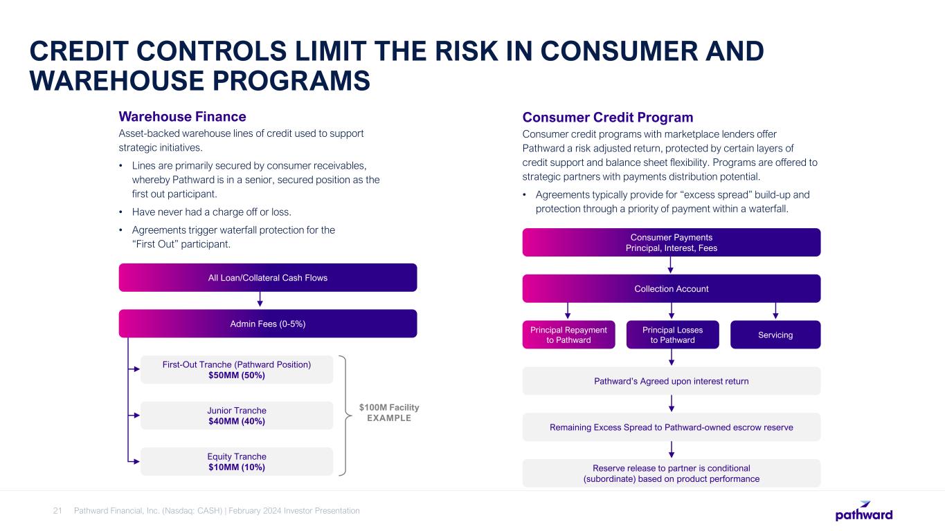 21 CREDIT CONTROLS LIMIT THE RISK IN CONSUMER AND WAREHOUSE PROGRAMS All Loan/Collateral Cash Flows Admin Fees (0-5%) Junior Tranche $40MM (40%) Equity Tranche $10MM (10%) First-Out Tranche (Pathward Position) $50MM (50%) $100M Facility EXAMPLE Warehouse Finance Asset-backed warehouse lines of credit used to support strategic initiatives. • Lines are primarily secured by consumer receivables, whereby Pathward is in a senior, secured position as the first out participant. • Have never had a charge off or loss. • Agreements trigger waterfall protection for the “First Out” participant. Consumer Payments Principal, Interest, Fees Collection Account Servicing Principal Losses to Pathward Principal Repayment to Pathward Pathward’s Agreed upon interest return Remaining Excess Spread to Pathward-owned escrow reserve Reserve release to partner is conditional (subordinate) based on product performance Consumer Credit Program Consumer credit programs with marketplace lenders offer Pathward a risk adjusted return, protected by certain layers of credit support and balance sheet flexibility. Programs are offered to strategic partners with payments distribution potential. • Agreements typically provide for “excess spread” build-up and protection through a priority of payment within a waterfall. Pathward Financial, Inc. (Nasdaq: CASH) | February 2024 Investor Presentation