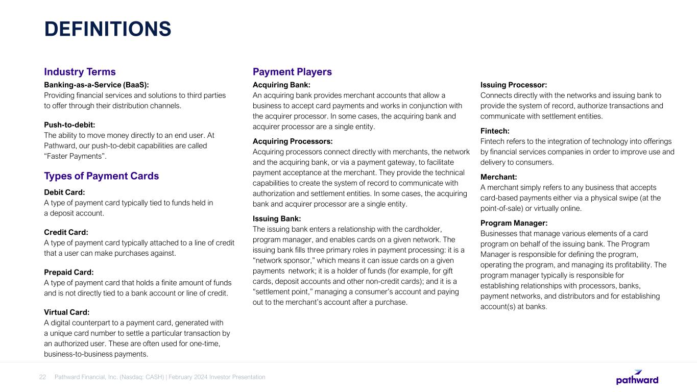 Industry Terms 22 Types of Payment Cards Banking-as-a-Service (BaaS): Providing financial services and solutions to third parties to offer through their distribution channels. Push-to-debit: The ability to move money directly to an end user. At Pathward, our push-to-debit capabilities are called “Faster Payments”. Debit Card: A type of payment card typically tied to funds held in a deposit account. Credit Card: A type of payment card typically attached to a line of credit that a user can make purchases against. Prepaid Card: A type of payment card that holds a finite amount of funds and is not directly tied to a bank account or line of credit. Virtual Card: A digital counterpart to a payment card, generated with a unique card number to settle a particular transaction by an authorized user. These are often used for one-time, business-to-business payments. Payment Players Acquiring Bank: An acquiring bank provides merchant accounts that allow a business to accept card payments and works in conjunction with the acquirer processor. In some cases, the acquiring bank and acquirer processor are a single entity. Acquiring Processors: Acquiring processors connect directly with merchants, the network and the acquiring bank, or via a payment gateway, to facilitate payment acceptance at the merchant. They provide the technical capabilities to create the system of record to communicate with authorization and settlement entities. In some cases, the acquiring bank and acquirer processor are a single entity. Issuing Bank: The issuing bank enters a relationship with the cardholder, program manager, and enables cards on a given network. The issuing bank fills three primary roles in payment processing: it is a “network sponsor,” which means it can issue cards on a given payments network; it is a holder of funds (for example, for gift cards, deposit accounts and other non-credit cards); and it is a “settlement point,” managing a consumer’s account and paying out to the merchant’s account after a purchase. Issuing Processor: Connects directly with the networks and issuing bank to provide the system of record, authorize transactions and communicate with settlement entities. Fintech: Fintech refers to the integration of technology into offerings by financial services companies in order to improve use and delivery to consumers. Merchant: A merchant simply refers to any business that accepts card-based payments either via a physical swipe (at the point-of-sale) or virtually online. Program Manager: Businesses that manage various elements of a card program on behalf of the issuing bank. The Program Manager is responsible for defining the program, operating the program, and managing its profitability. The program manager typically is responsible for establishing relationships with processors, banks, payment networks, and distributors and for establishing account(s) at banks. DEFINITIONS Pathward Financial, Inc. (Nasdaq: CASH) | February 2024 Investor Presentation