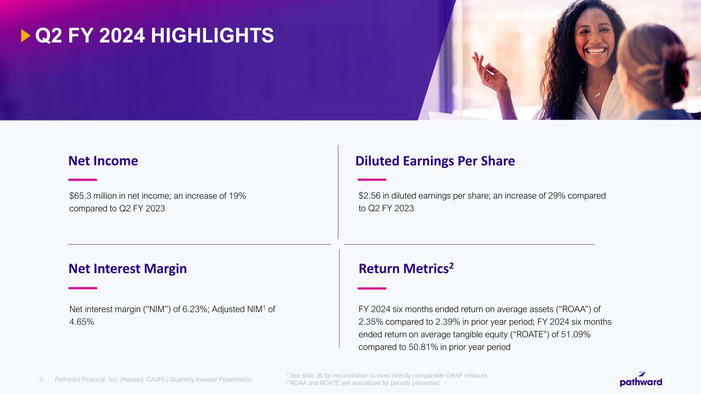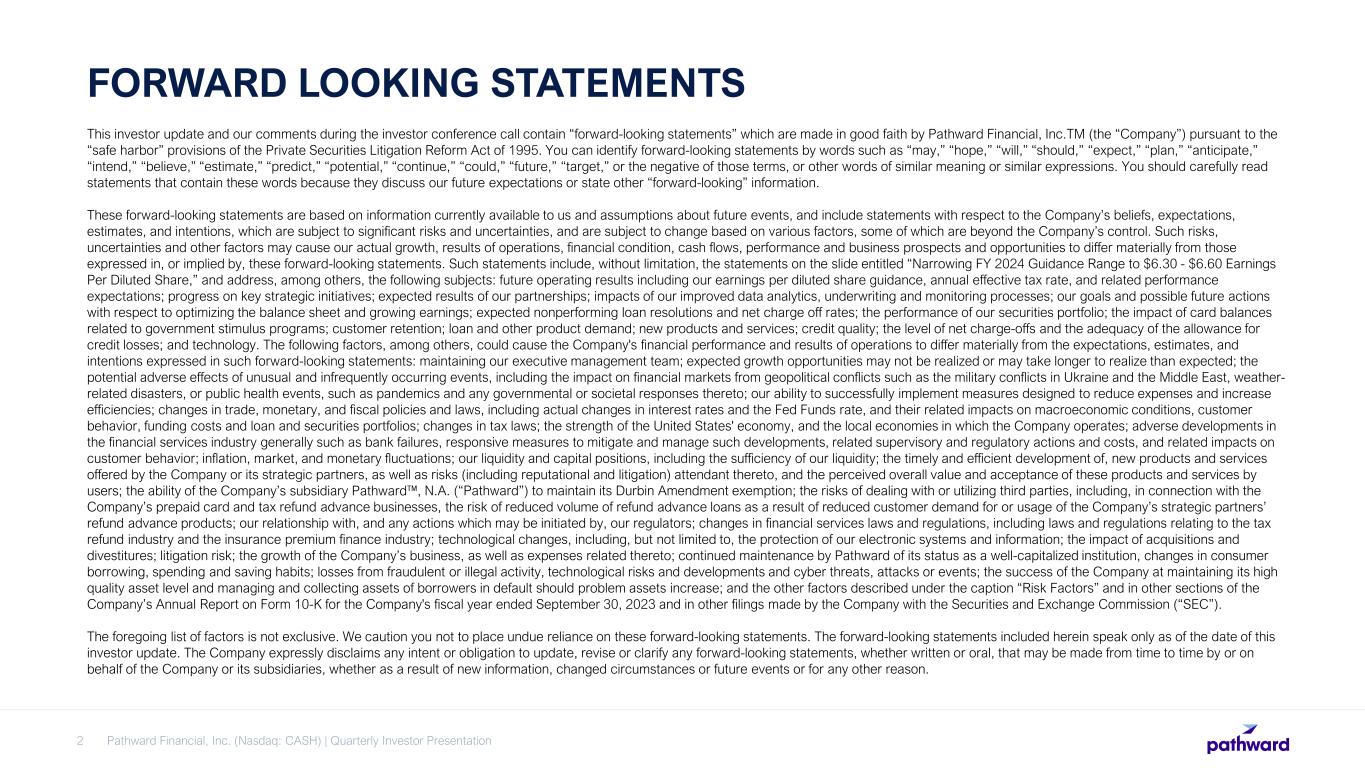 FORWARD LOOKING STATEMENTS This investor update and our comments during the investor conference call contain “forward-looking statements” which are made in good faith by Pathward Financial, Inc.TM (the “Company”) pursuant to the “safe harbor” provisions of the Private Securities Litigation Reform Act of 1995. You can identify forward-looking statements by words such as “may,” “hope,” “will,” “should,” “expect,” “plan,” “anticipate,” “intend,” “believe,” “estimate,” “predict,” “potential,” “continue,” “could,” “future,” “target,” or the negative of those terms, or other words of similar meaning or similar expressions. You should carefully read statements that contain these words because they discuss our future expectations or state other “forward-looking” information. These forward-looking statements are based on information currently available to us and assumptions about future events, and include statements with respect to the Company’s beliefs, expectations, estimates, and intentions, which are subject to significant risks and uncertainties, and are subject to change based on various factors, some of which are beyond the Company’s control. Such risks, uncertainties and other factors may cause our actual growth, results of operations, financial condition, cash flows, performance and business prospects and opportunities to differ materially from those expressed in, or implied by, these forward-looking statements. Such statements include, without limitation, the statements on the slide entitled “Narrowing FY 2024 Guidance Range to $6.30 - $6.60 Earnings Per Diluted Share,” and address, among others, the following subjects: future operating results including our earnings per diluted share guidance, annual effective tax rate, and related performance expectations; progress on key strategic initiatives; expected results of our partnerships; impacts of our improved data analytics, underwriting and monitoring processes; our goals and possible future actions with respect to optimizing the balance sheet and growing earnings; expected nonperforming loan resolutions and net charge off rates; the performance of our securities portfolio; the impact of card balances related to government stimulus programs; customer retention; loan and other product demand; new products and services; credit quality; the level of net charge-offs and the adequacy of the allowance for credit losses; and technology. The following factors, among others, could cause the Company's financial performance and results of operations to differ materially from the expectations, estimates, and intentions expressed in such forward-looking statements: maintaining our executive management team; expected growth opportunities may not be realized or may take longer to realize than expected; the potential adverse effects of unusual and infrequently occurring events, including the impact on financial markets from geopolitical conflicts such as the military conflicts in Ukraine and the Middle East, weather- related disasters, or public health events, such as pandemics and any governmental or societal responses thereto; our ability to successfully implement measures designed to reduce expenses and increase efficiencies; changes in trade, monetary, and fiscal policies and laws, including actual changes in interest rates and the Fed Funds rate, and their related impacts on macroeconomic conditions, customer behavior, funding costs and loan and securities portfolios; changes in tax laws; the strength of the United States' economy, and the local economies in which the Company operates; adverse developments in the financial services industry generally such as bank failures, responsive measures to mitigate and manage such developments, related supervisory and regulatory actions and costs, and related impacts on customer behavior; inflation, market, and monetary fluctuations; our liquidity and capital positions, including the sufficiency of our liquidity; the timely and efficient development of, new products and services offered by the Company or its strategic partners, as well as risks (including reputational and litigation) attendant thereto, and the perceived overall value and acceptance of these products and services by users; the ability of the Company’s subsidiary Pathward , N.A. (“Pathward”) to maintain its Durbin Amendment exemption; the risks of dealing with or utilizing third parties, including, in connection with the Company’s prepaid card and tax refund advance businesses, the risk of reduced volume of refund advance loans as a result of reduced customer demand for or usage of the Company’s strategic partners’ refund advance products; our relationship with, and any actions which may be initiated by, our regulators; changes in financial services laws and regulations, including laws and regulations relating to the tax refund industry and the insurance premium finance industry; technological changes, including, but not limited to, the protection of our electronic systems and information; the impact of acquisitions and divestitures; litigation risk; the growth of the Company’s business, as well as expenses related thereto; continued maintenance by Pathward of its status as a well-capitalized institution, changes in consumer borrowing, spending and saving habits; losses from fraudulent or illegal activity, technological risks and developments and cyber threats, attacks or events; the success of the Company at maintaining its high quality asset level and managing and collecting assets of borrowers in default should problem assets increase; and the other factors described under the caption “Risk Factors” and in other sections of the Company’s Annual Report on Form 10-K for the Company's fiscal year ended September 30, 2023 and in other filings made by the Company with the Securities and Exchange Commission (“SEC”). The foregoing list o