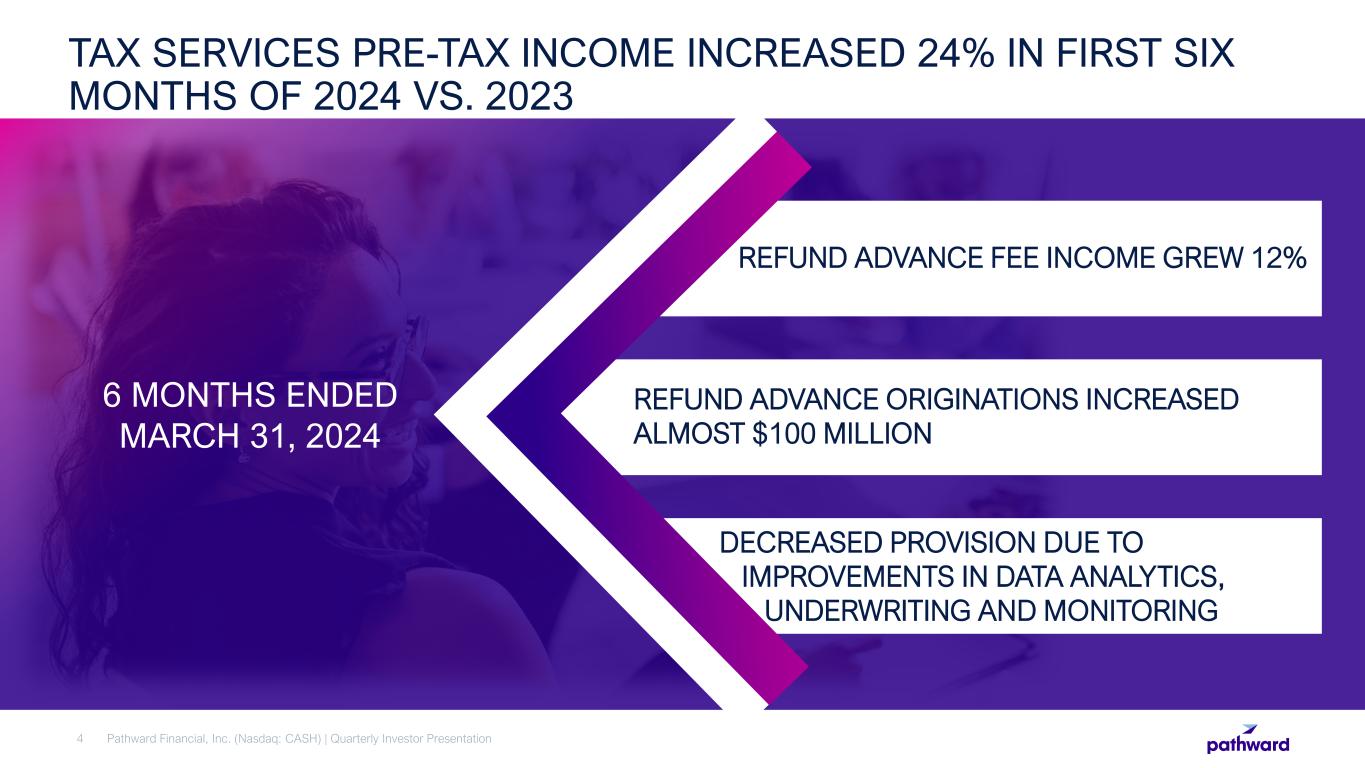 Net Income $65.3 million in net income; an increase of 19% compared to Q2 FY 2023 Diluted Earnings Per Share $2.56 in diluted earnings per share; an increase of 29% compared to Q2 FY 2023 Net Interest Margin Net interest margin (“NIM”) of 6.23%; Adjusted NIM1 of 4.65% Return Metrics2 FY 2024 six months ended return on average assets (“ROAA”) of 2.35% compared to 2.39% in prior year period; FY 2024 six months ended return on average tangible equity (“ROATE”) of 51.09% compared to 50.81% in prior year period Q2 FY 2024 HIGHLIGHTS Pathward Financial, Inc. (Nasdaq: CASH) | Quarterly Investor Presentation3 1 See slide 36 for reconciliation to most directly comparable GAAP measure. 2 ROAA and ROATE are annualized for periods presented.