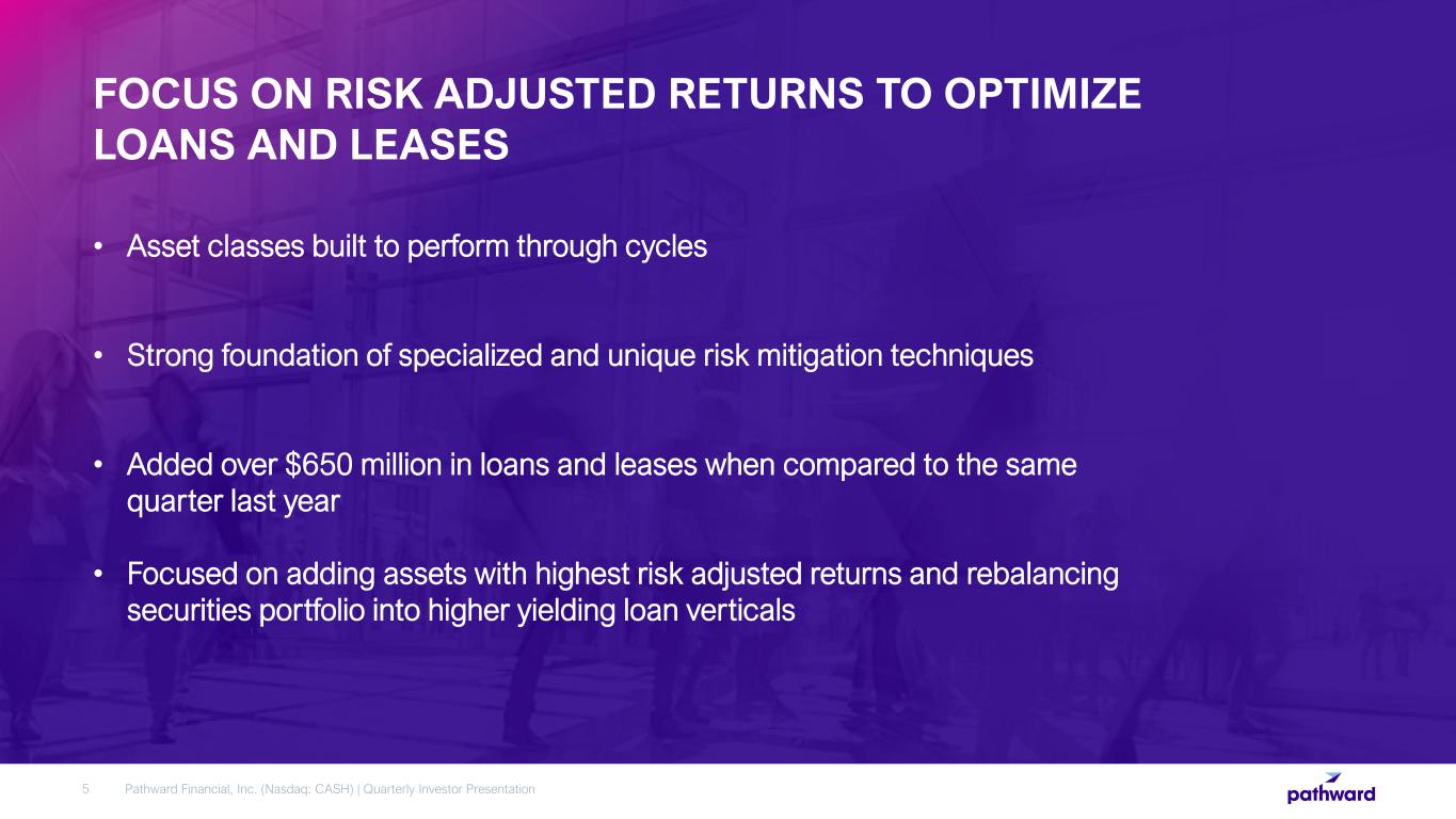 6 MONTHS ENDED MARCH 31, 2024 TAX SERVICES PRE-TAX INCOME INCREASED 24% IN FIRST SIX MONTHS OF 2024 VS. 2023 Pathward Financial, Inc. (Nasdaq: CASH) | Quarterly Investor Presentation4 REFUND ADVANCE FEE INCOME GREW 12% REFUND ADVANCE ORIGINATIONS INCREASED ALMOST $100 MILLION DECREASED PROVISION DUE TO IMPROVEMENTS IN DATA ANALYTICS, UNDERWRITING AND MONITORING