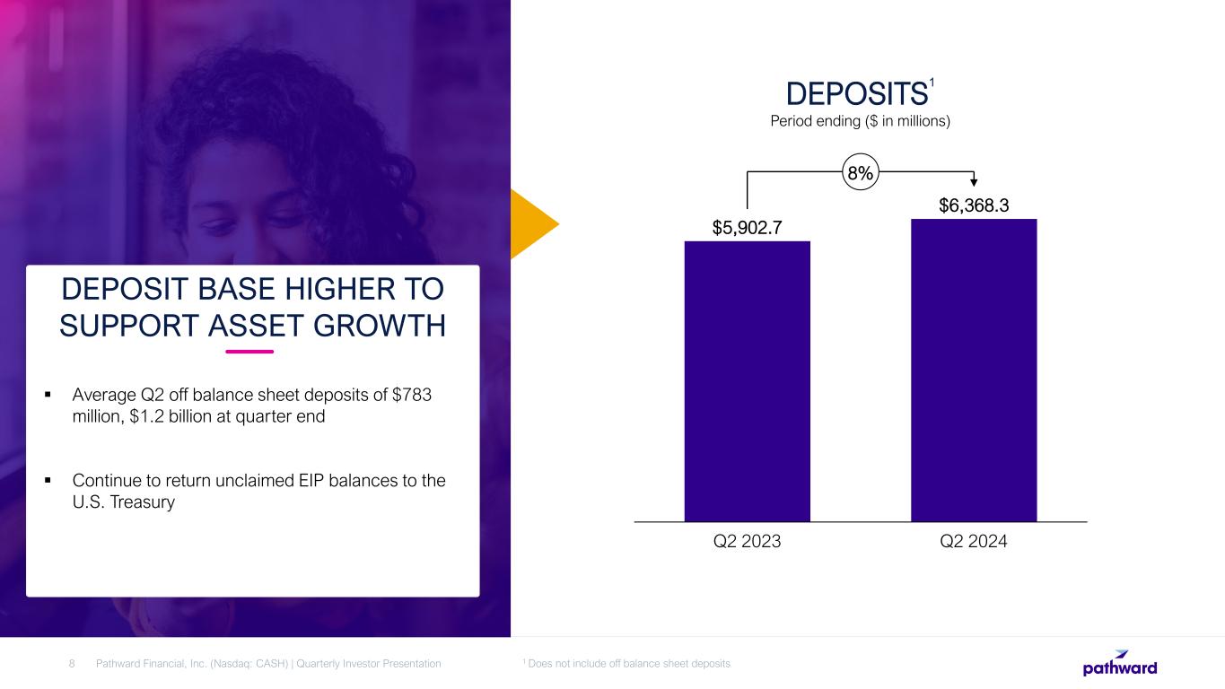 NET INTEREST INCOME DRIVES GROWTH IN EPS ($ IN MILLIONS, EXCEPT PER SHARE DATA) Pathward Financial, Inc. (Nasdaq: CASH) | Quarterly Investor Presentation7 $118.3 Q2 2023 Q2 2024 $101.4 +17% Net Interest Income $140.4 Q2 2023 Q2 2024 $127.1 +10% Noninterest Expenses $128.9 Q2 2023 Q2 2024 $127.0 +2% Noninterest Income $65.3 Q2 2023 Q2 2024 $54.8 +19% Net Income Attributable to Parent $2.56 Q2 2023 Q2 2024 $1.99 +29% Earnings per Diluted Share