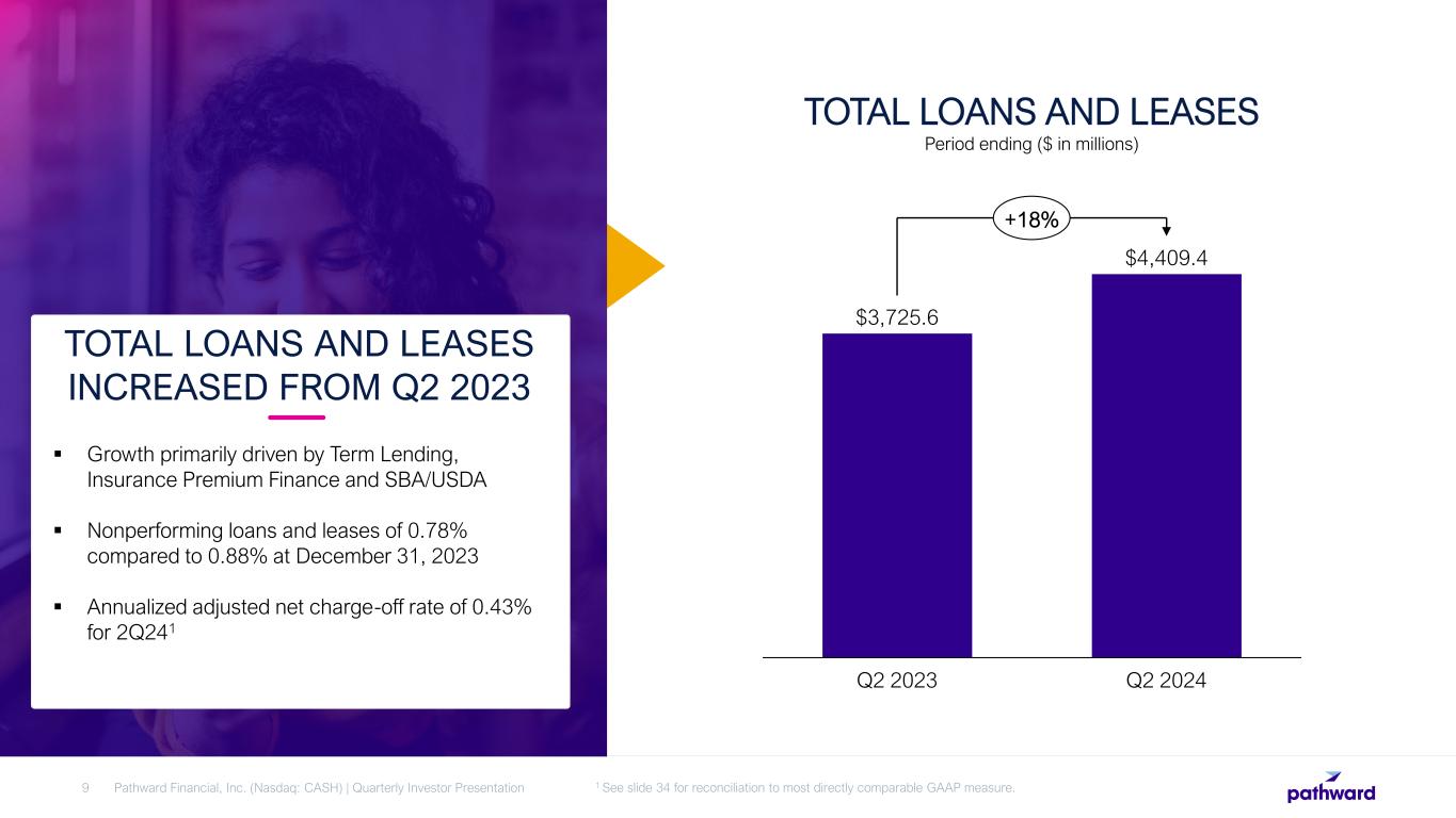  Average Q2 off balance sheet deposits of $783 million, $1.2 billion at quarter end  Continue to return unclaimed EIP balances to the U.S. Treasury DEPOSIT BASE HIGHER TO SUPPORT ASSET GROWTH $5,902.7 $6,368.3 Q2 2023 Q2 2024 8% DEPOSITS 1 Period ending ($ in millions) Pathward Financial, Inc. (Nasdaq: CASH) | Quarterly Investor Presentation8 1 Does not include off balance sheet deposits