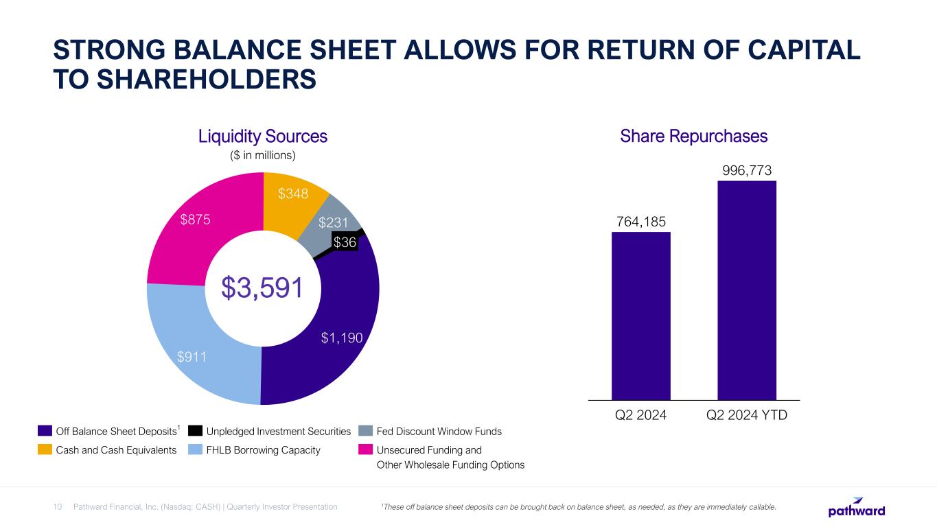 TOTAL LOANS AND LEASES INCREASED FROM Q2 2023  Growth primarily driven by Term Lending, Insurance Premium Finance and SBA/USDA  Nonperforming loans and leases of 0.78% compared to 0.88% at December 31, 2023  Annualized adjusted net charge-off rate of 0.43% for 2Q241 $3,725.6 $4,409.4 Q2 2023 Q2 2024 +18% TOTAL LOANS AND LEASES Period ending ($ in millions) Pathward Financial, Inc. (Nasdaq: CASH) | Quarterly Investor Presentation9 1 See slide 34 for reconciliation to most directly comparable GAAP measure.