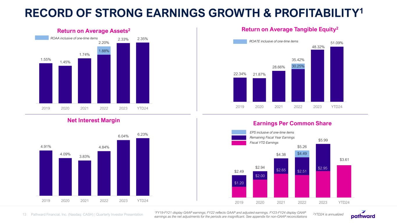 RECORD OF STRONG EARNINGS GROWTH AND PROFITABILITY ABOVE BANKING INDUSTRY AVERAGES EXCESS CAPITAL GENERATING BUSINESS ENABLES ONGOING RETURN OF VALUE TO SHAREHOLDERS INVESTMENT HIGHLIGHTS 2 3 4 1 5 EXPERIENCED LEADER IN FAST-GROWING BANKING AS A SERVICE (BAAS) SECTOR, WITH DIVERSIFIED PORTFOLIO OF HIGH- QUALITY FINANCIAL PARTNERS RESILIENT COMMERCIAL FINANCE LOAN PORTFOLIO PRODUCES ATTRACTIVE RETURNS THROUGHOUT ECONOMIC CYCLES HIGHLY ADVANTAGEOUS NATIONAL BANK CHARTER, WITH WELL-DEVELOPED RISK MITIGATION AND COMPLIANCE CAPABILITIES Pathward Financial, Inc. (Nasdaq: CASH) | Quarterly Investor Presentation12