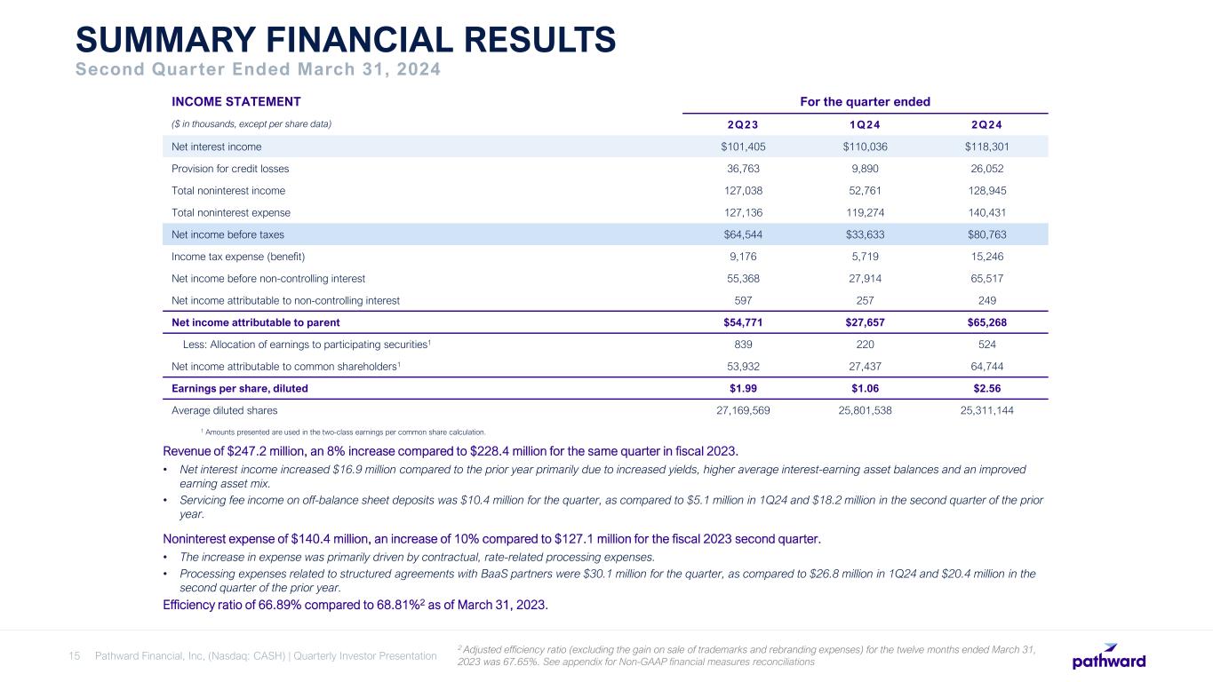  Pathward’s track record of profitability, combined with its commitment to maintaining the size of its balance sheet, enables the return of the majority of earnings through repurchases and dividends.  Targeting regulatory capital leverage ratio above 8% and total risk weighted capital ratio above 12%.  Paid dividend every quarter dating back to 1994.  Executed $39.1 million of share repurchases in 2Q24. RETURN OF CAPITAL TO SHAREHOLDERS TRACK RECORD OF STRONG EARNINGS GROWTH AND RIGHT-SIZED BALANCE SHEET ENABLES ONGOING RETURN OF CAPITAL Capital Returned to Shareholders Note: Repurchased common shares include shares withheld to cover income taxes owed by participants related to share-based incentive plans. $590.0M TOTAL SHARE REPURCHASES 2Q19 TO 2Q24 $33.3M TOTAL DIVIDENDS PAID 2Q19 TO 2Q24 Pathward Financial, Inc. (Nasdaq: CASH) | Quarterly Investor Presentation14