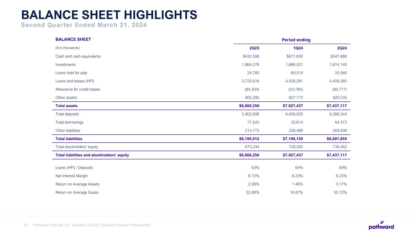 Pathward Financial, Inc, (Nasdaq: CASH) | Quarterly Investor Presentation15 SUMMARY FINANCIAL RESULTS Second Quarter Ended March 31, 2024 INCOME STATEMENT For the quarter ended ($ in thousands, except per share data) 2Q23 1Q24 2Q24 Net interest income $101,405 $110,036 $118,301 Provision for credit losses 36,763 9,890 26,052 Total noninterest income 127,038 52,761 128,945 Total noninterest expense 127,136 119,274 140,431 Net income before taxes $64,544 $33,633 $80,763 Income tax expense (benefit) 9,176 5,719 15,246 Net income before non-controlling interest 55,368 27,914 65,517 Net income attributable to non-controlling interest 597 257 249 Net income attributable to parent $54,771 $27,657 $65,268 Less: Allocation of earnings to participating securities1 839 220 524 Net income attributable to common shareholders1 53,932 27,437 64,744 Earnings per share, diluted $1.99 $1.06 $2.56 Average diluted shares 27,169,569 25,801,538 25,311,144 Revenue of $247.2 million, an 8% increase compared to $228.4 million for the same quarter in fiscal 2023. • Net interest income increased $16.9 million compared to the prior year primarily due to increased yields, higher average interest-earning asset balances and an improved earning asset mix. • Servicing fee income on off-balance sheet deposits was $10.4 million for the quarter, as compared to $5.1 million in 1Q24 and $18.2 million in the second quarter of the prior year. Noninterest expense of $140.4 million, an increase of 10% compared to $127.1 million for the fiscal 2023 second quarter. • The increase in expense was primarily driven by contractual, rate-related processing expenses. • Processing expenses related to structured agreements with BaaS partners were $30.1 million for the quarter, as compared to $26.8 million in 1Q24 and $20.4 million in the second quarter of the prior year. Efficiency ratio of 66.89% compared to 68.81%2 as of March 31, 2023. 1 Amounts presented are used in the two-class earnings per common share calculation. 2 Adjusted efficiency ratio (excluding the gain on sale of trademarks and rebranding expenses) for the twelve months ended March 31, 2023 was 67.65%. See appendix for Non-GAAP financial measures reconciliations
