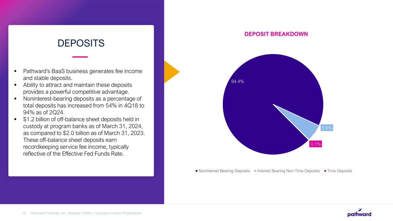 • Total tax product revenue increased 1% through the six months ended March 31, 2024 compared to the same period of the prior year. • Refund Advance originations of $1.56 billion in the 2024 tax season through March 31, 2024 compared to $1.46 billion in the 2023 tax season. • Decreases in provision from improving data analytics, underwriting and monitoring. 2024 TAX SEASON UPDATE Pathward Financial, Inc. (Nasdaq: CASH) | Quarterly Investor Presentation17 1 Approximate loss rate calculated by taking provision for loan & lease losses divided by total refund advance originations. It also includes recoveries from prior tax season. TAX SERVICES ECONOMICS Six Months Ended ($ in millions) March 31, 2023 March 31, 2024 % Change Net interest income (expense) 2.86 0.22 (92)% Refund Advance product income 38.61 43.31 12% Refund Transfer product income 30.88 29.36 (5)% Total revenue 72.35 72.89 1% Total expense 9.60 9.43 (2)% Provision for credit losses 33.06 26.58 (20)% Net income, pre-tax 29.69 36.88 24% Total refund advance originations $ 1,459 $ 1,559 7% Approximate loss rate¹ (6 months) 2.27% 1.70% (25)%