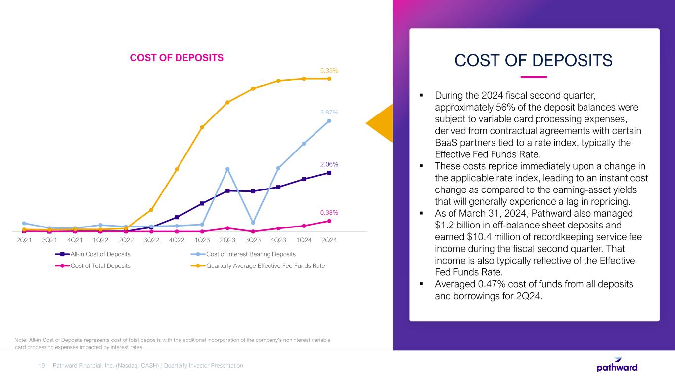  Pathward’s BaaS business generates fee income and stable deposits.  Ability to attract and maintain these deposits provides a powerful competitive advantage.  Noninterest-bearing deposits as a percentage of total deposits has increased from 54% in 4Q18 to 94% as of 2Q24.  $1.2 billion of off-balance sheet deposits held in custody at program banks as of March 31, 2024, as compared to $2.0 billion as of March 31, 2023. These off-balance sheet deposits earn recordkeeping service fee income, typically reflective of the Effective Fed Funds Rate. Pathward Financial, Inc. (Nasdaq: CASH) | Quarterly Investor Presentation18 DEPOSIT BREAKDOWN 94.4% 5.5% 0.1% Noninterest Bearing Deposits Interest Bearing Non-Time Deposits Time Deposits DEPOSITS