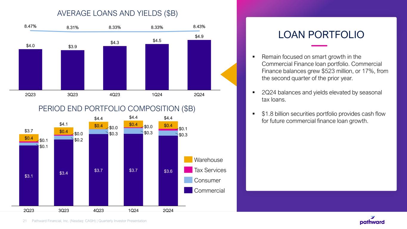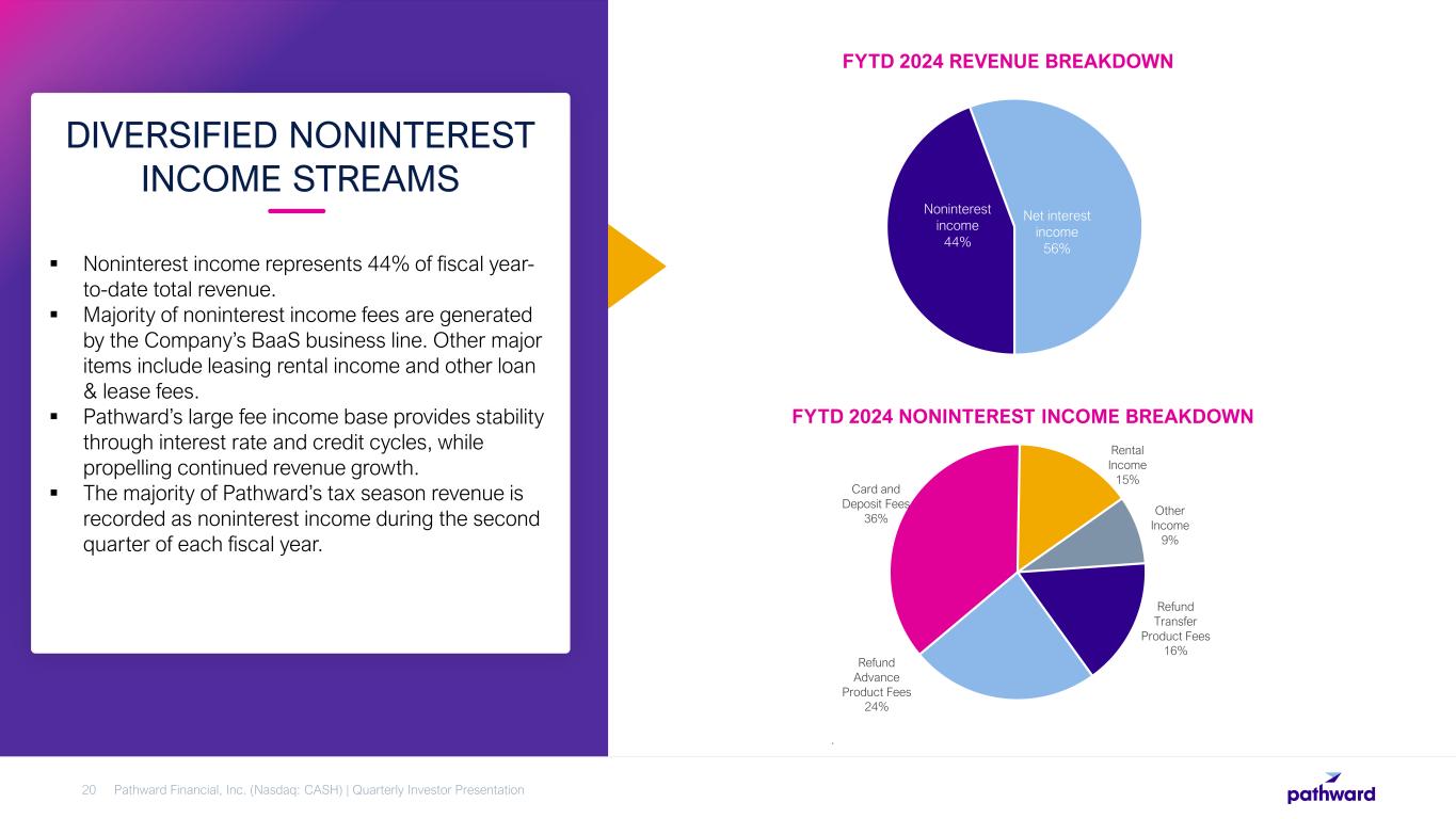  Noninterest income represents 44% of fiscal year- to-date total revenue.  Majority of noninterest income fees are generated by the Company’s BaaS business line. Other major items include leasing rental income and other loan & lease fees.  Pathward’s large fee income base provides stability through interest rate and credit cycles, while propelling continued revenue growth.  The majority of Pathward’s tax season revenue is recorded as noninterest income during the second quarter of each fiscal year. DIVERSIFIED NONINTEREST INCOME STREAMS Pathward Financial, Inc. (Nasdaq: CASH) | Quarterly Investor Presentation20 Refund Transfer Product Fees 16% Refund Advance Product Fees 24% Card and Deposit Fees 36% Rental Income 15% Other Income 9% FYTD 2024 NONINTEREST INCOME BREAKDOWN . Noninterest income 44% Net interest income 56% FYTD 2024 REVENUE BREAKDOWN