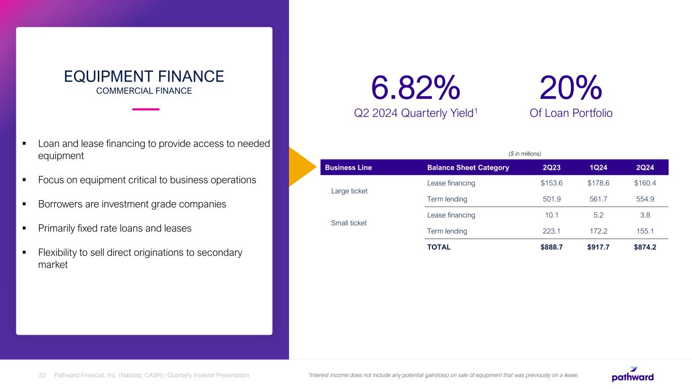  Remain focused on smart growth in the Commercial Finance loan portfolio. Commercial Finance balances grew $523 million, or 17%, from the second quarter of the prior year.  2Q24 balances and yields elevated by seasonal tax loans.  $1.8 billion securities portfolio provides cash flow for future commercial finance loan growth. LOAN PORTFOLIO Pathward Financial, Inc. (Nasdaq: CASH) | Quarterly Investor Presentation21 AVERAGE LOANS AND YIELDS ($B) PERIOD END PORTFOLIO COMPOSITION ($B) $3.1 $3.4 $3.7 $3.7 $3.6 $0.1 $0.2 $0.3 $0.3 $0.3 $0.1 $0.0 $0.0 $0.0 $0.1 $0.4 $0.4 $0.4 $0.4 $0.4 2Q23 3Q23 4Q23 1Q24 2Q24 $3.7 $4.1 $4.4 $4.4 $4.4 Warehouse Tax Services Consumer Commercial $4.0 $3.9 $4.3 $4.5 $4.9 8.47% 8.31% 8.33% 8.33% 8.43% 2Q23 3Q23 4Q23 1Q24 2Q24