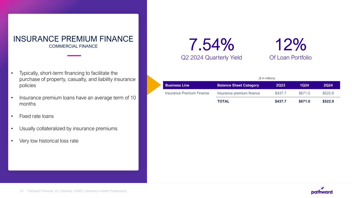 • Provides working capital for companies to meet short- term operational requirements • Primarily variable rate loans with majority of floors at or above 6% • Bank typically has dominion of funds • Heavily collateral-managed • Historically excels during economic downturns WORKING CAPITAL FINANCE COMMERCIAL FINANCE Pathward Financial, Inc. (Nasdaq: CASH) | Quarterly Investor Presentation23 14.19% Q2 2024 Quarterly Yield 17% Of Loan Portfolio Business Line Balance Sheet Category 2Q23 1Q24 2Q24 Working Capital Asset-based lending $378.0 $379.7 $429.6 Factoring 338.9 336.0 336.4 TOTAL $716.9 $715.7 $766.0 ($ in millions)
