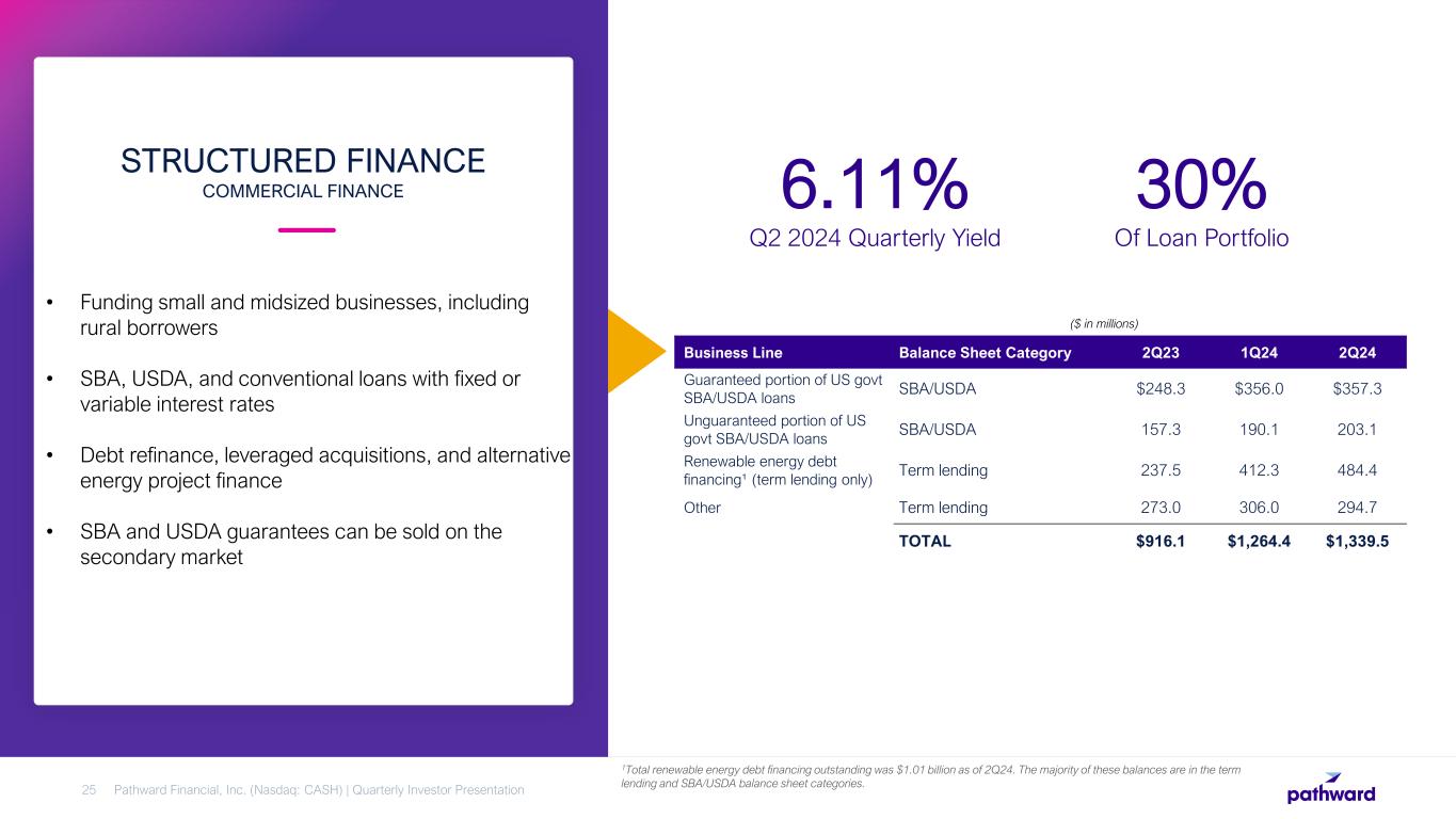 • Typically, short-term financing to facilitate the purchase of property, casualty, and liability insurance policies • Insurance premium loans have an average term of 10 months • Fixed rate loans • Usually collateralized by insurance premiums • Very low historical loss rate INSURANCE PREMIUM FINANCE COMMERCIAL FINANCE Pathward Financial, Inc. (Nasdaq: CASH) | Quarterly Investor Presentation24 7.54% Q2 2024 Quarterly Yield 12% Of Loan Portfolio ($ in millions) Business Line Balance Sheet Category 2Q23 1Q24 2Q24 Insurance Premium Finance Insurance premium finance $437.7 $671.0 $522.9 TOTAL $437.7 $671.0 $522.9