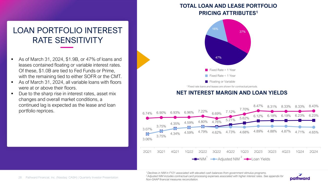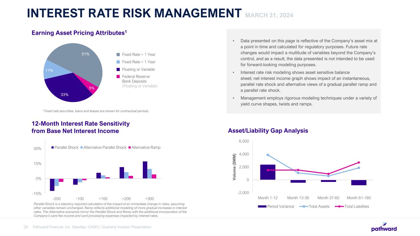  As of March 31, 2024, $1.9B, or 47% of loans and leases contained floating or variable interest rates. Of these, $1.0B are tied to Fed Funds or Prime, with the remaining tied to either SOFR or the CMT.  As of March 31, 2024, all variable loans with floors were at or above their floors.  Due to the sharp rise in interest rates, asset mix changes and overall market conditions, a continued lag is expected as the lease and loan portfolio reprices. LOAN PORTFOLIO INTEREST RATE SENSITIVITY Pathward Financial, Inc. (Nasdaq: CASH) | Quarterly Investor Presentation28 1 Fixed rate loans and leases are shown for contractual periods. 47% 16% 37% Fixed Rate > 1 Year TOTAL LOAN AND LEASE PORTFOLIO PRICING ATTRIBUTES1 Fixed Rate < 1 Year Floating or Variable NET INTEREST MARGIN AND LOAN YIELDS 3.07% 3.75% 4.35% 4.59% 4.80% 4.76% 5.21% 5.62% 6.12% 6.18% 6.19% 6.23% 6.23% 3.06% 3.75% 4.34% 4.59% 4.79% 4.62% 4.73% 4.68% 4.89% 4.88% 4.87% 4.71% 4.65% 6.74% 6.90% 6.93% 6.96% 7.22% 6.69% 7.12% 7.70% 8.47% 8.31% 8.33% 8.33% 8.43% 2Q21 3Q21 4Q21 1Q22 2Q22 3Q22 4Q22 1Q23 2Q23 3Q23 4Q23 1Q24 2Q24 NIM Adjusted NIM Loan Yields 1 Declines in NIM in FY21 associated with elevated cash balances from government stimulus programs. 2 Adjusted NIM includes contractual card processing expenses associated with higher interest rates. See appendix for Non-GAAP financial measures reconciliation. 1 2