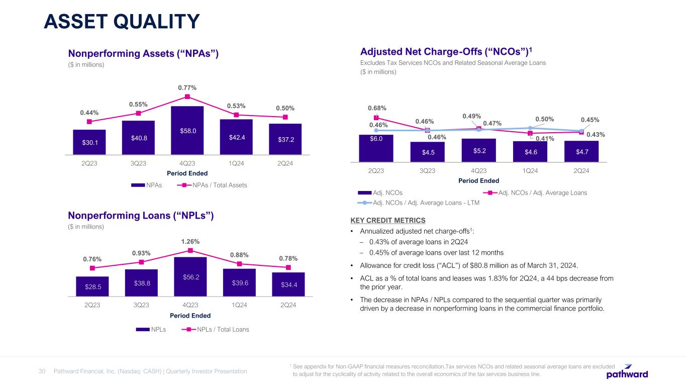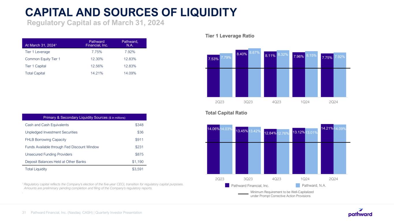 Pathward Financial, Inc. (Nasdaq: CASH) | Quarterly Investor Presentation30 ASSET QUALITY $6.0 $4.5 $5.2 $4.6 $4.7 0.68% 0.46% 0.49% 0.41% 0.43% 0.46% 0.46% 0.47% 0.50% 0.45% 2Q23 3Q23 4Q23 1Q24 2Q24 Period Ended Adj. NCOs Adj. NCOs / Adj. Average Loans Adj. NCOs / Adj. Average Loans - LTM Adjusted Net Charge-Offs (“NCOs”)1 Excludes Tax Services NCOs and Related Seasonal Average Loans ($ in millions) KEY CREDIT METRICS • Annualized adjusted net charge-offs1: – 0.43% of average loans in 2Q24 – 0.45% of average loans over last 12 months • Allowance for credit loss (“ACL”) of $80.8 million as of March 31, 2024. • ACL as a % of total loans and leases was 1.83% for 2Q24, a 44 bps decrease from the prior year. • The decrease in NPAs / NPLs compared to the sequential quarter was primarily driven by a decrease in nonperforming loans in the commercial finance portfolio. 1 See appendix for Non-GAAP financial measures reconciliation.Tax services NCOs and related seasonal average loans are excluded to adjust for the cyclicality of activity related to the overall economics of the tax services business line. $28.5 $38.8 $56.2 $39.6 $34.4 0.76% 0.93% 1.26% 0.88% 0.78% 2Q23 3Q23 4Q23 1Q24 2Q24 Period Ended NPLs NPLs / Total Loans Nonperforming Assets (“NPAs”) ($ in millions) Nonperforming Loans (“NPLs”) ($ in millions) $30.1 $40.8 $58.0 $42.4 $37.2 0.44% 0.55% 0.77% 0.53% 0.50% 2Q23 3Q23 4Q23 1Q24 2Q24 Period Ended NPAs NPAs / Total Assets