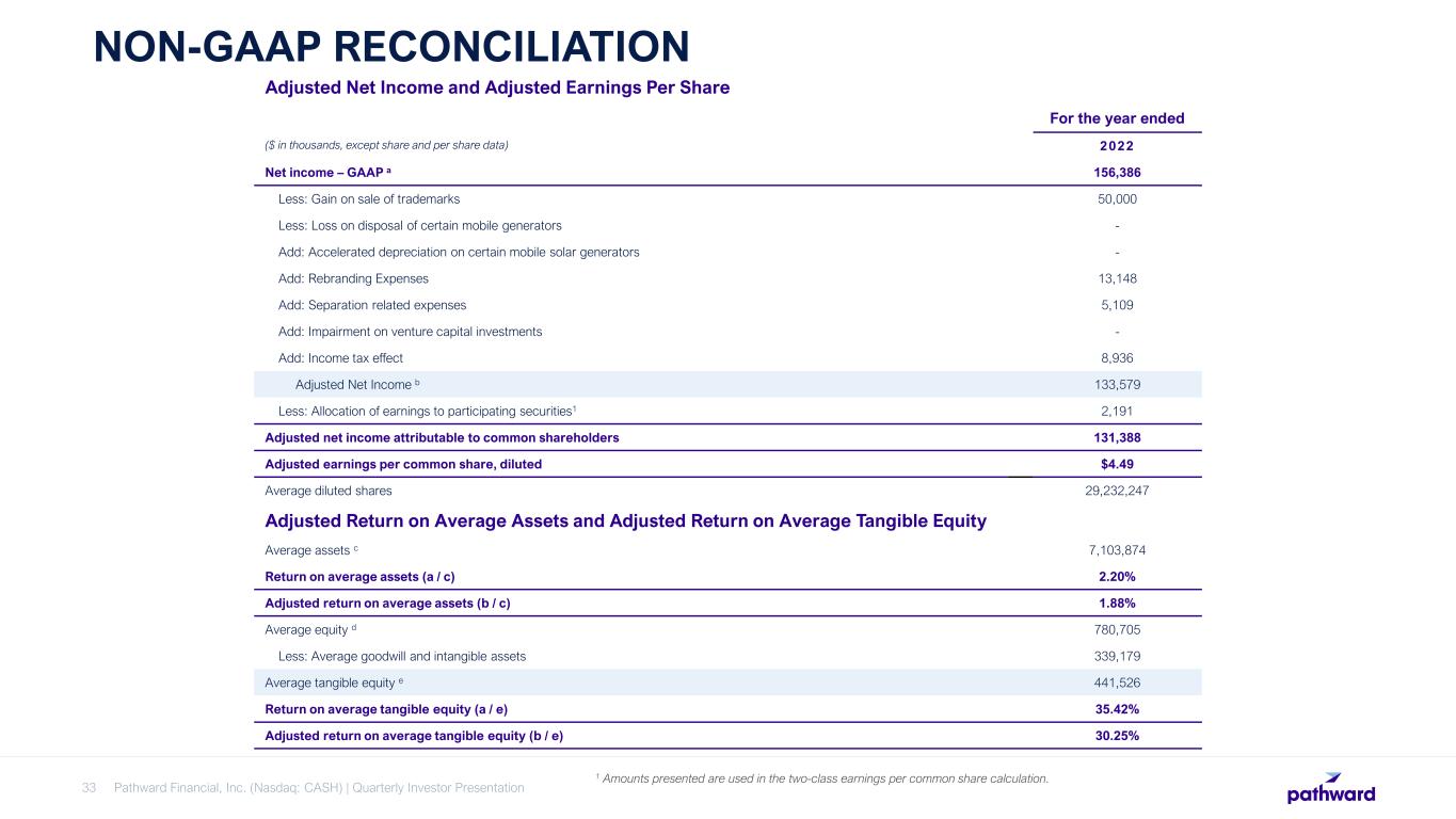 Pathward Financial, Inc. (Nasdaq: CASH) | Quarterly Investor Presentation33 NON-GAAP RECONCILIATION 1 Amounts presented are used in the two-class earnings per common share calculation. Adjusted Net Income and Adjusted Earnings Per Share For the year ended ($ in thousands, except share and per share data) 2022 Net income – GAAP a 156,386 Less: Gain on sale of trademarks 50,000 Less: Loss on disposal of certain mobile generators - Add: Accelerated depreciation on certain mobile solar generators - Add: Rebranding Expenses 13,148 Add: Separation related expenses 5,109 Add: Impairment on venture capital investments - Add: Income tax effect 8,936 Adjusted Net Income b 133,579 Less: Allocation of earnings to participating securities1 2,191 Adjusted net income attributable to common shareholders 131,388 Adjusted earnings per common share, diluted $4.49 Average diluted shares 29,232,247 Adjusted Return on Average Assets and Adjusted Return on Average Tangible Equity Average assets c 7,103,874 Return on average assets (a / c) 2.20% Adjusted return on average assets (b / c) 1.88% Average equity d 780,705 Less: Average goodwill and intangible assets 339,179 Average tangible equity e 441,526 Return on average tangible equity (a / e) 35.42% Adjusted return on average tangible equity (b / e) 30.25%