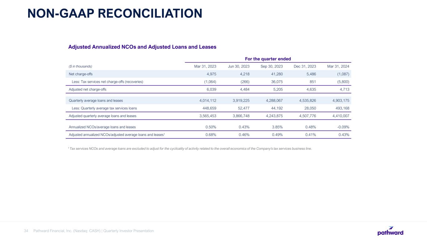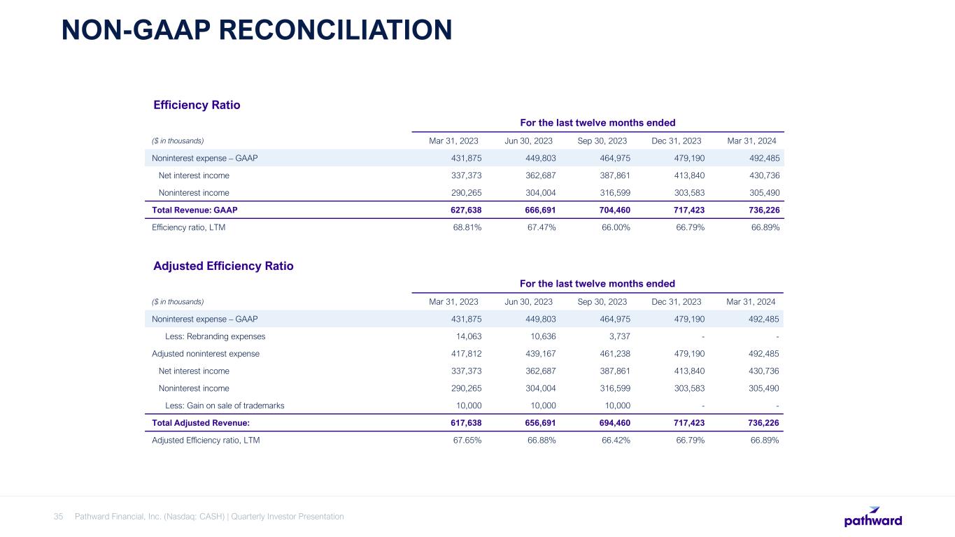 Pathward Financial, Inc. (Nasdaq: CASH) | Quarterly Investor Presentation34 NON-GAAP RECONCILIATION 1 Tax services NCOs and average loans are excluded to adjust for the cyclicality of activity related to the overall economics of the Company's tax services business line. For the quarter ended ($ in thousands) Mar 31, 2023 Jun 30, 2023 Sep 30, 2023 Dec 31, 2023 Mar 31, 2024 Net charge-offs 4,975 4,218 41,280 5,486 (1,087) Less: Tax services net charge-offs (recoveries) (1,064) (266) 36,075 851 (5,800) Adjusted net charge-offs 6,039 4,484 5,205 4,635 4,713 Quarterly average loans and leases 4,014,112 3,919,225 4,288,067 4,535,826 4,903,175 Less: Quarterly average tax services loans 448,659 52,477 44,192 28,050 493,168 Adjusted quarterly average loans and leases 3,565,453 3,866,748 4,243,875 4,507,776 4,410,007 Annualized NCOs/average loans and leases 0.50% 0.43% 3.85% 0.48% -0.09% Adjusted annualized NCOs/adjusted average loans and leases1 0.68% 0.46% 0.49% 0.41% 0.43% Adjusted Annualized NCOs and Adjusted Loans and Leases