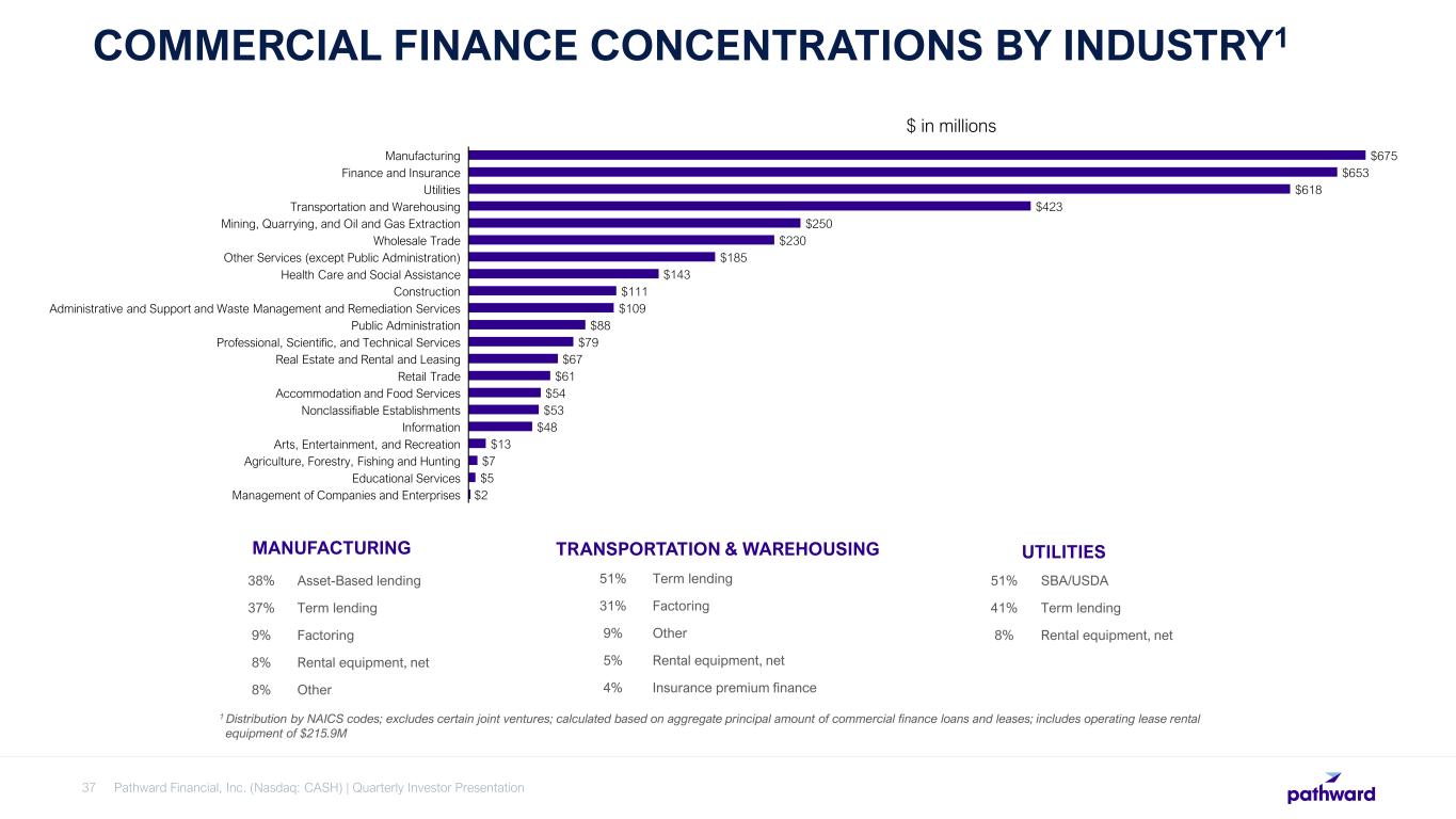 Pathward Financial, Inc. (Nasdaq: CASH) | Quarterly Investor Presentation37 COMMERCIAL FINANCE CONCENTRATIONS BY INDUSTRY1 1 Distribution by NAICS codes; excludes certain joint ventures; calculated based on aggregate principal amount of commercial finance loans and leases; includes operating lease rental equipment of $215.9M MANUFACTURING 38% Asset-Based lending 37% Term lending 9% Factoring 8% Rental equipment, net 8% Other TRANSPORTATION & WAREHOUSING 51% Term lending 31% Factoring 9% Other 5% Rental equipment, net 4% Insurance premium finance UTILITIES 51% SBA/USDA 41% Term lending 8% Rental equipment, net $675 $653 $618 $423 $250 $230 $185 $143 $111 $109 $88 $79 $67 $61 $54 $53 $48 $13 $7 $5 $2 Manufacturing Finance and Insurance Utilities Transportation and Warehousing Mining, Quarrying, and Oil and Gas Extraction Wholesale Trade Other Services (except Public Administration) Health Care and Social Assistance Construction Administrative and Support and Waste Management and Remediation Services Public Administration Professional, Scientific, and Technical Services Real Estate and Rental and Leasing Retail Trade Accommodation and Food Services Nonclassifiable Establishments Information Arts, Entertainment, and Recreation Agriculture, Forestry, Fishing and Hunting Educational Services Management of Companies and Enterprises $ in millions