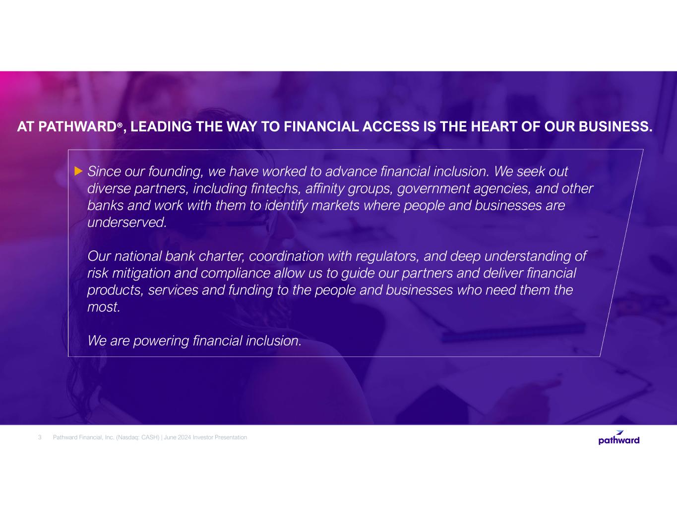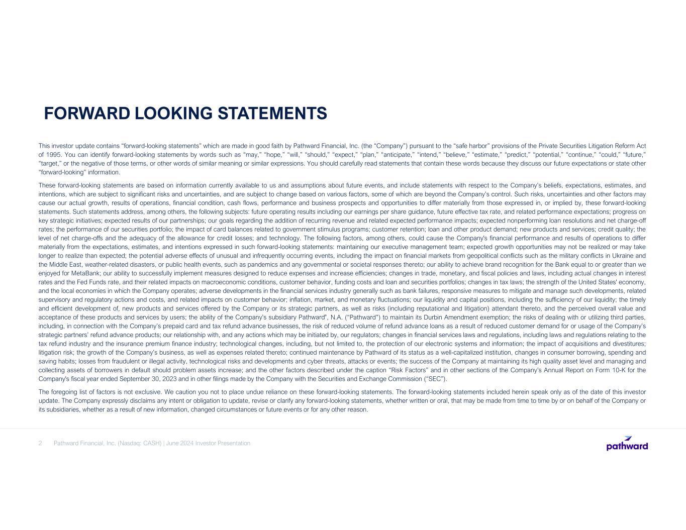 Pathward Financial, Inc. (Nasdaq: CASH) | June 2024 Investor Presentation2 FORWARD LOOKING STATEMENTS This investor update contains “forward-looking statements” which are made in good faith by Pathward Financial, Inc. (the “Company”) pursuant to the “safe harbor” provisions of the Private Securities Litigation Reform Act of 1995. You can identify forward-looking statements by words such as “may,” “hope,” “will,” “should,” “expect,” “plan,” “anticipate,” “intend,” “believe,” “estimate,” “predict,” “potential,” “continue,” “could,” “future,” “target,” or the negative of those terms, or other words of similar meaning or similar expressions. You should carefully read statements that contain these words because they discuss our future expectations or state other “forward-looking” information. These forward-looking statements are based on information currently available to us and assumptions about future events, and include statements with respect to the Company’s beliefs, expectations, estimates, and intentions, which are subject to significant risks and uncertainties, and are subject to change based on various factors, some of which are beyond the Company’s control. Such risks, uncertainties and other factors may cause our actual growth, results of operations, financial condition, cash flows, performance and business prospects and opportunities to differ materially from those expressed in, or implied by, these forward-looking statements. Such statements address, among others, the following subjects: future operating results including our earnings per share guidance, future effective tax rate, and related performance expectations; progress on key strategic initiatives; expected results of our partnerships; our goals regarding the addition of recurring revenue and related expected performance impacts; expected nonperforming loan resolutions and net charge-off rates; the performance of our securities portfolio; the impact of card balances related to government stimulus programs; customer retention; loan and other product demand; new products and services; credit quality; the level of net charge-offs and the adequacy of the allowance for credit losses; and technology. The following factors, among others, could cause the Company's financial performance and results of operations to differ materially from the expectations, estimates, and intentions expressed in such forward-looking statements: maintaining our executive management team; expected growth opportunities may not be realized or may take longer to realize than expected; the potential adverse effects of unusual and infrequently occurring events, including the impact on financial markets from geopolitical conflicts such as the military conflicts in Ukraine and the Middle East, weather-related disasters, or public health events, such as pandemics and any governmental or societal responses thereto; our ability to achieve brand recognition for the Bank equal to or greater than we enjoyed for MetaBank; our ability to successfully implement measures designed to reduce expenses and increase efficiencies; changes in trade, monetary, and fiscal policies and laws, including actual changes in interest rates and the Fed Funds rate, and their related impacts on macroeconomic conditions, customer behavior, funding costs and loan and securities portfolios; changes in tax laws; the strength of the United States' economy, and the local economies in which the Company operates; adverse developments in the financial services industry generally such as bank failures, responsive measures to mitigate and manage such developments, related supervisory and regulatory actions and costs, and related impacts on customer behavior; inflation, market, and monetary fluctuations; our liquidity and capital positions, including the sufficiency of our liquidity; the timely and efficient development of, new products and services offered by the Company or its strategic partners, as well as risks (including reputational and litigation) attendant thereto, and the perceived overall value and acceptance of these products and services by users; the ability of the Company’s subsidiary Pathward®, N.A. (“Pathward”) to maintain its Durbin Amendment exemption; the risks of dealing with or utilizing third parties, including, in connection with the Company’s prepaid card and tax refund advance businesses, the risk of reduced volume of refund advance loans as a result of reduced customer demand for or usage of the Company’s strategic partners’ refund advance products; our relationship with, and any actions which may be initiated by, our regulators; changes in financial services laws and regulations, including laws and regulations relating to the tax refund industry and the insurance premium finance industry; technological changes, including, but not limited to, the protection of our electronic systems and information; the impact of acquisitions and divestitures; litigation risk; the growth of the Company’s business, as well as expenses related thereto; continued maintenance by Pathward of its status as a well-capitalized institution, changes in consumer borrowing, spending and saving habits; losses from fraudulent or illegal activity, technological risks and developments and cyber threats, attacks or events; the success of the Company at maintaining its high quality asset level and managing and collecting assets of borrowers in default should problem assets increase; and the other factors described under the caption “Risk Factors” and in other sections of the Company’s Annual Report on Form 10-K for the Company's fiscal year ended September 30, 2023 and in other filings made by the Company with the Securities and Exchange Commission (“SEC”). The foregoing list of factors is not exclusive. We caution you not to place undue reliance on these forward-looking statements. The forward-looki