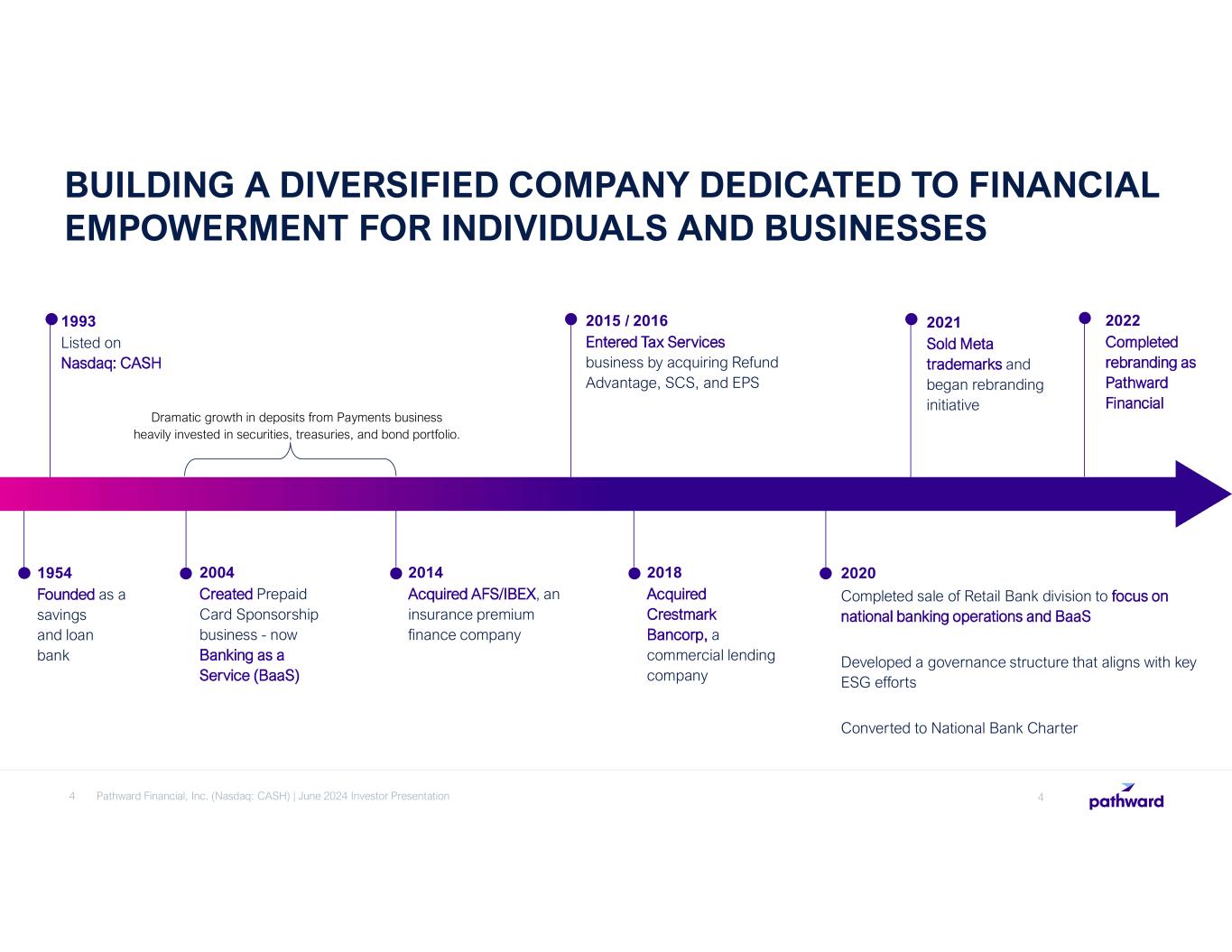 Since our founding, we have worked to advance financial inclusion. We seek out diverse partners, including fintechs, affinity groups, government agencies, and other banks and work with them to identify markets where people and businesses are underserved. Our national bank charter, coordination with regulators, and deep understanding of risk mitigation and compliance allow us to guide our partners and deliver financial products, services and funding to the people and businesses who need them the most. We are powering financial inclusion. AT PATHWARD®, LEADING THE WAY TO FINANCIAL ACCESS IS THE HEART OF OUR BUSINESS. 3 Pathward Financial, Inc. (Nasdaq: CASH) | June 2024 Investor Presentation
